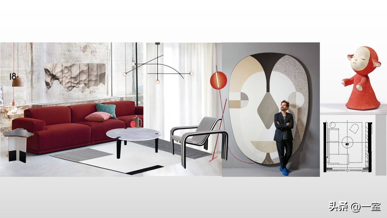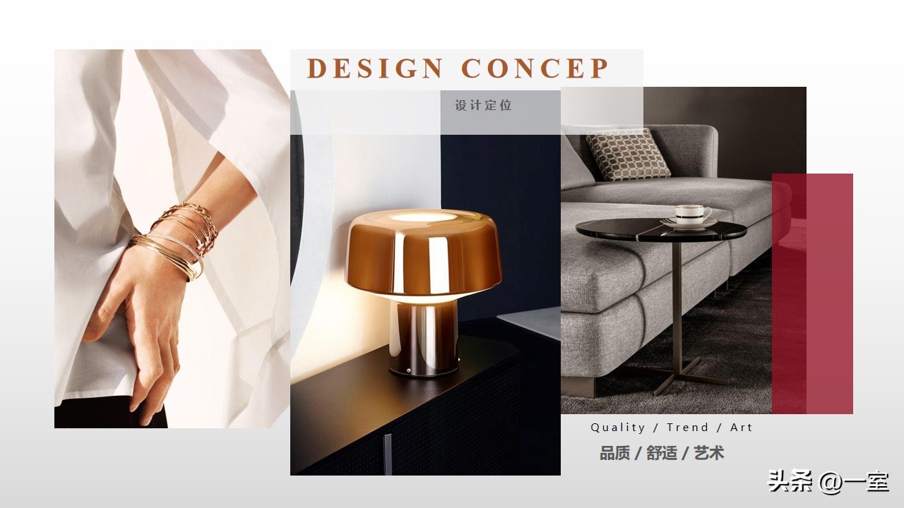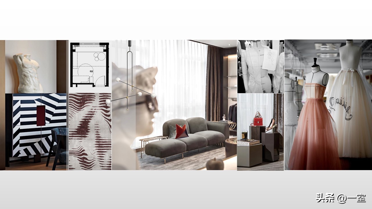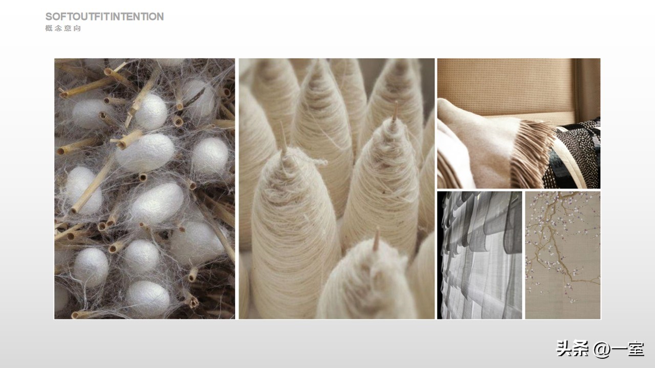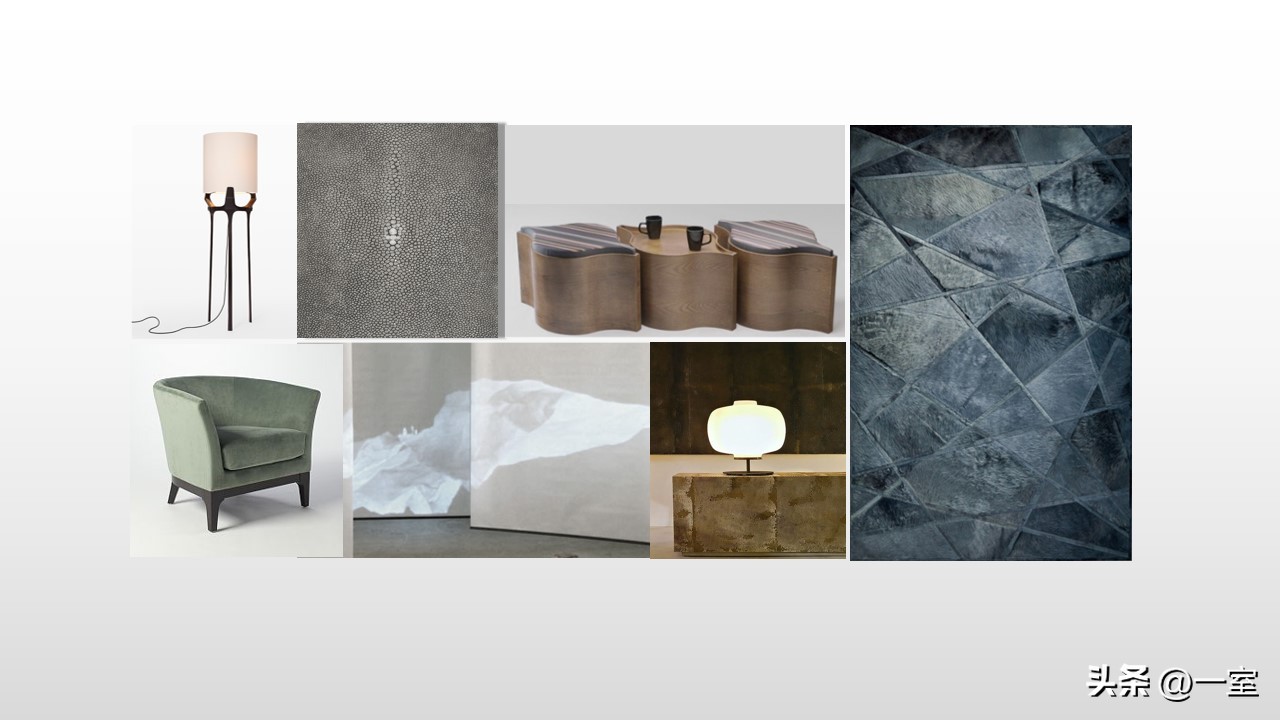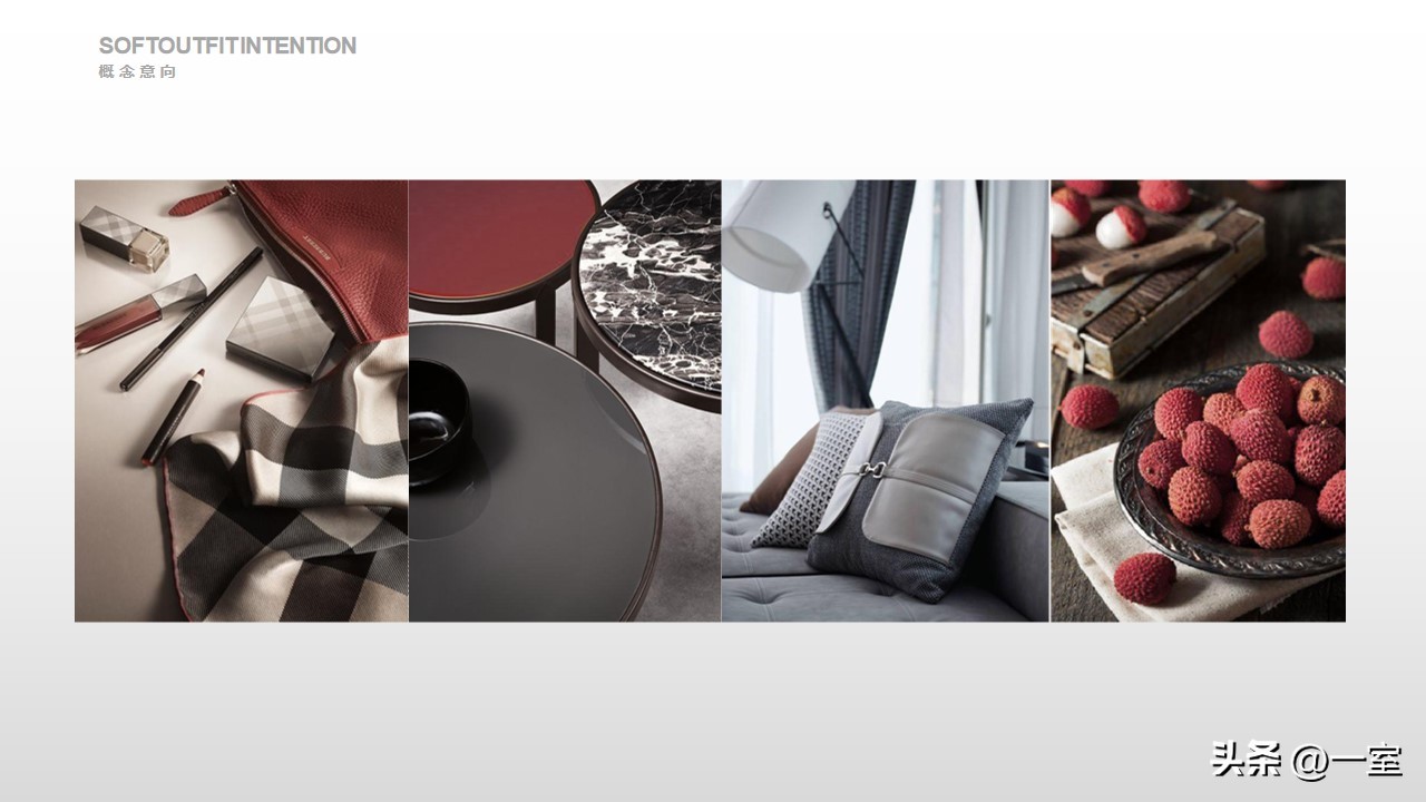 软装意向一般不会出现在最初阶段的PPT中,当设计方案基本确定时,下一步到了深入设计的效果图阶段时,软装意向就该确定了。