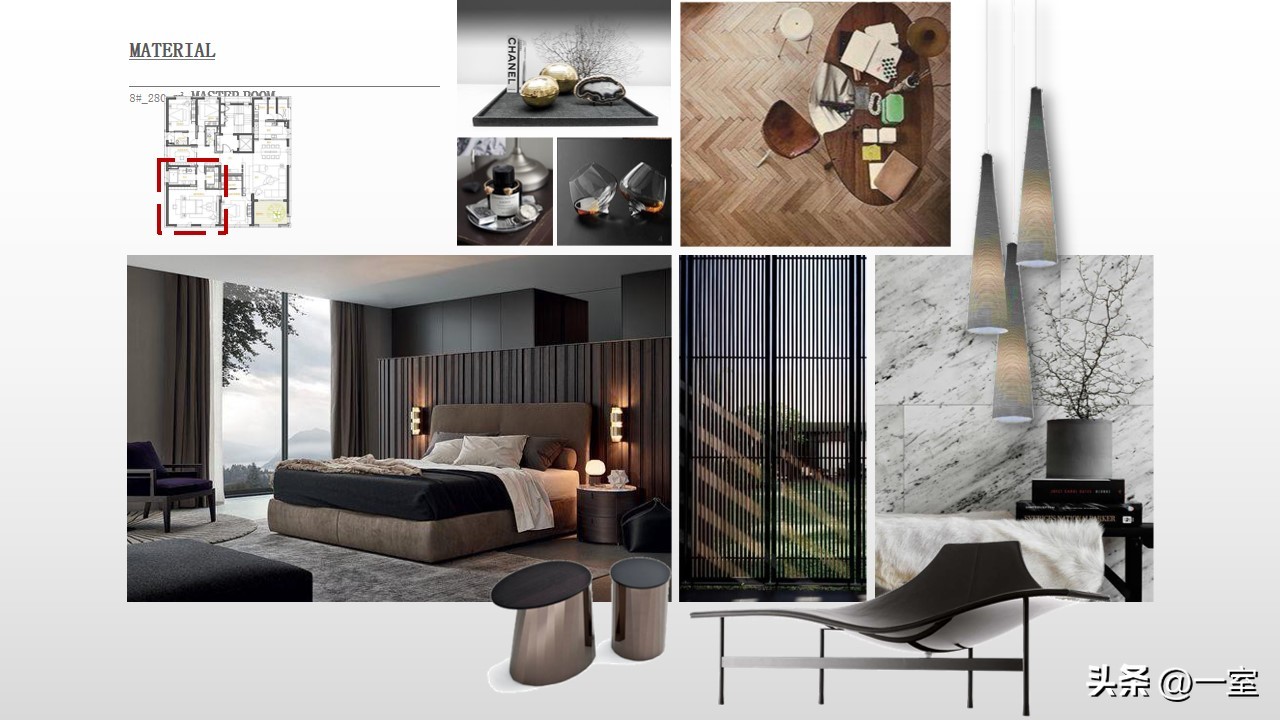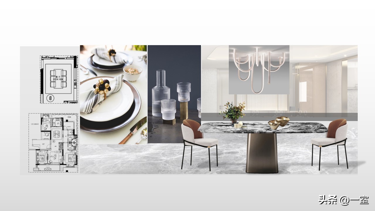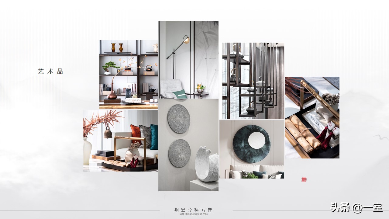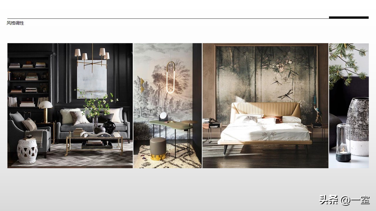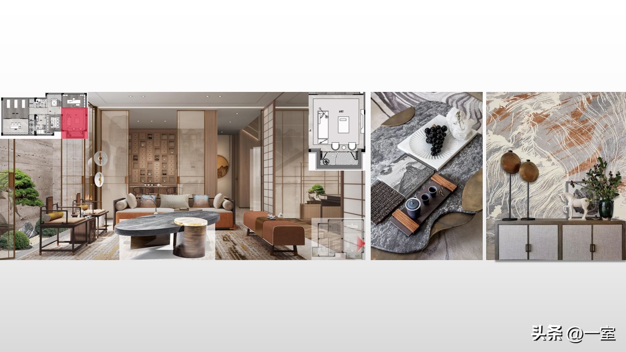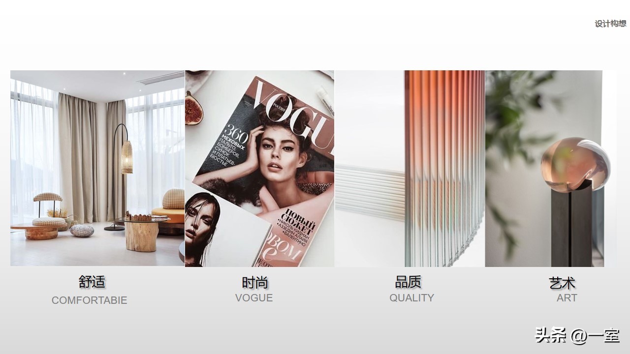 软装意向一般不会出现在最初阶段的PPT中,当设计方案基本确定时,下一步到了深入设计的效果图阶段时,软装意向就该确定了。