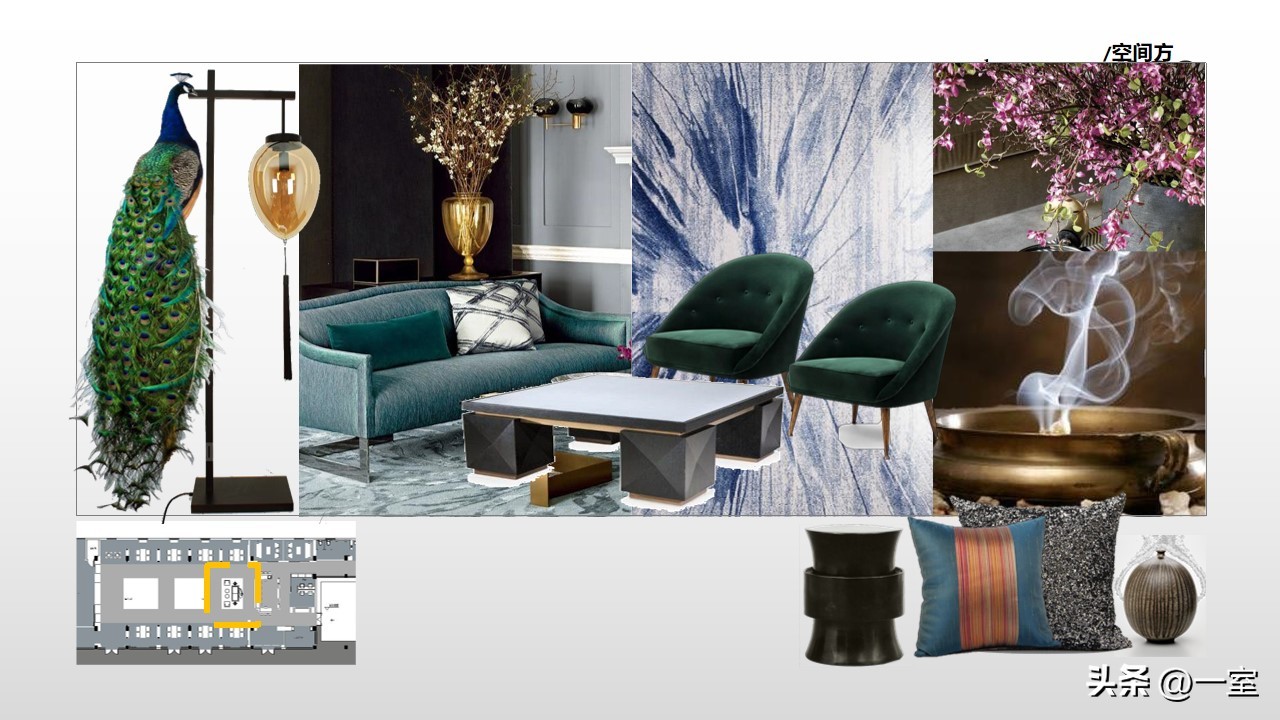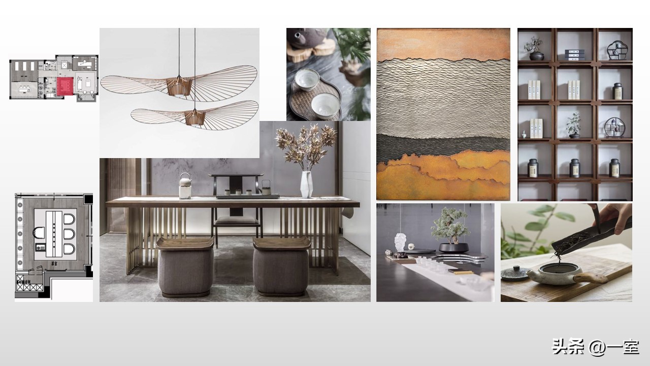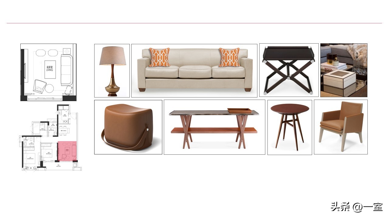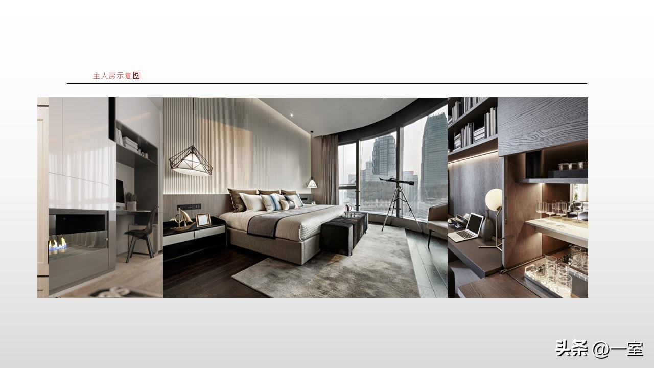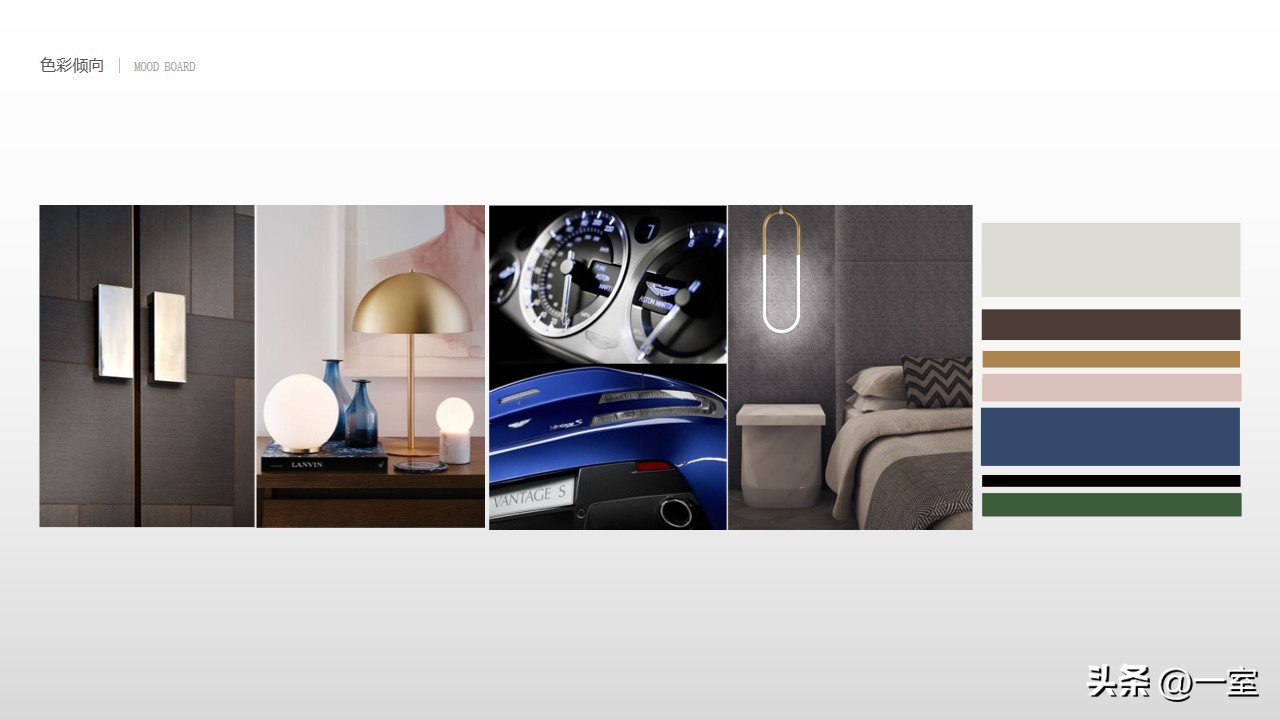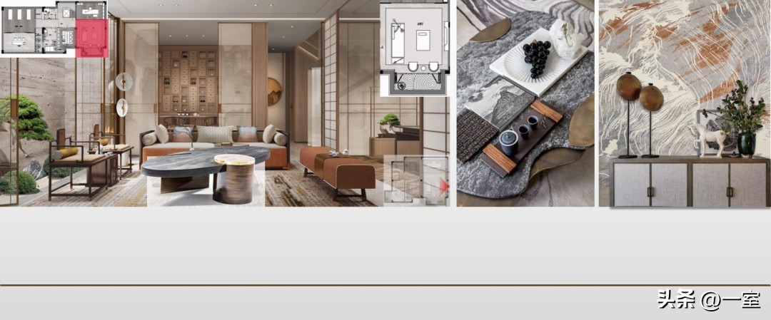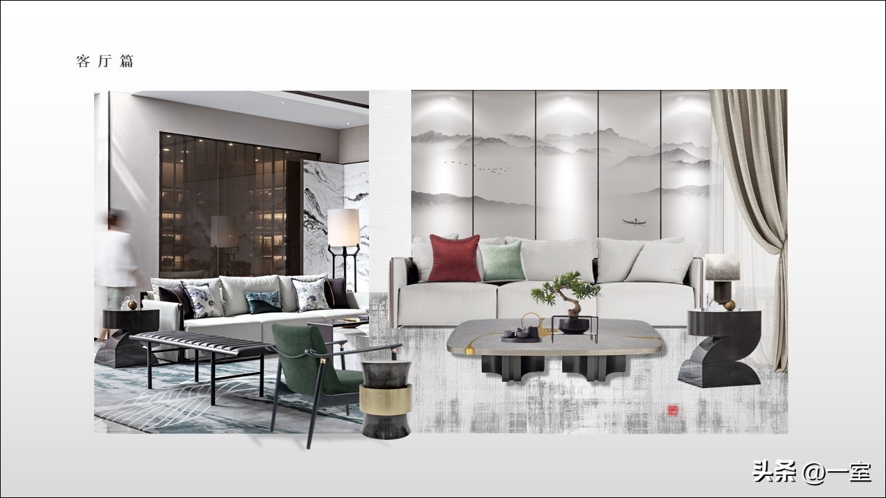 软装意向一般不会出现在最初阶段的PPT中,当设计方案基本确定时,下一步到了深入设计的效果图阶段时,软装意向就该确定了。
