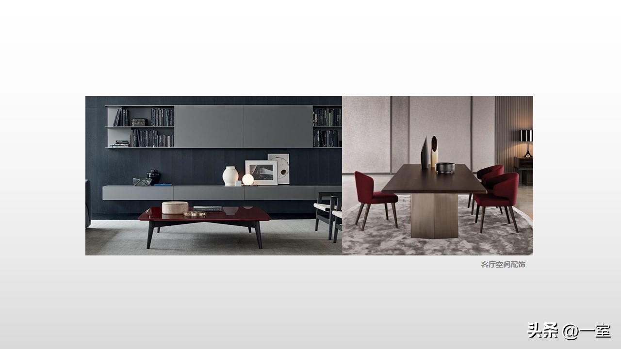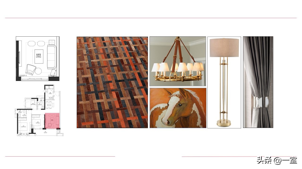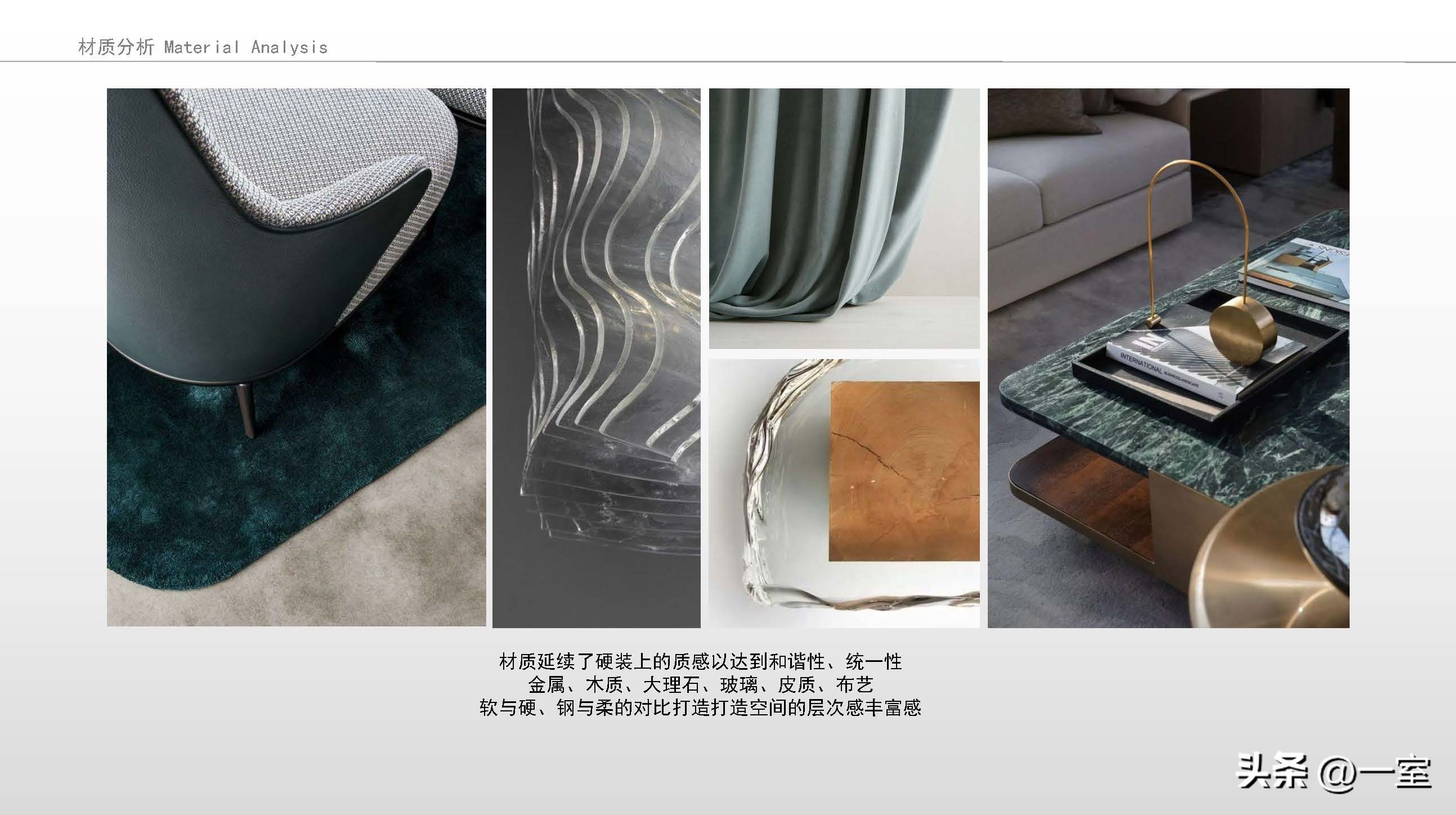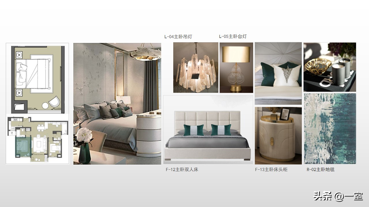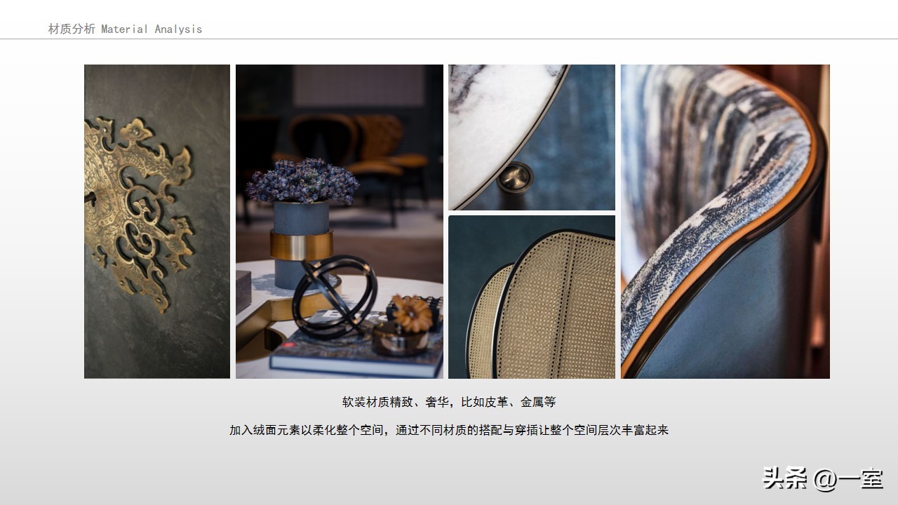 软装意向一般不会出现在最初阶段的PPT中,当设计方案基本确定时,下一步到了深入设计的效果图阶段时,软装意向就该确定了。
