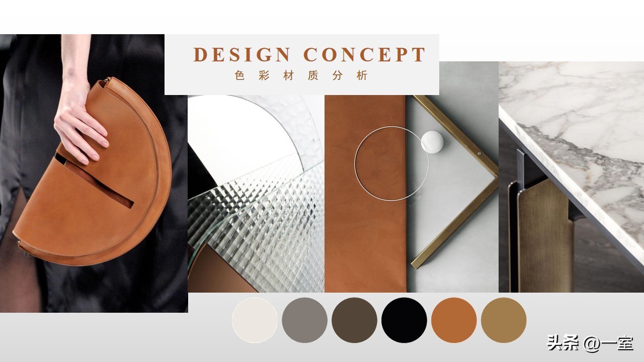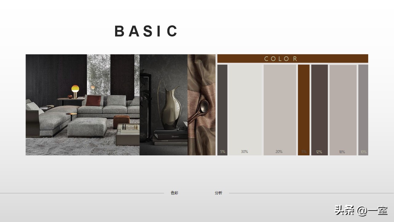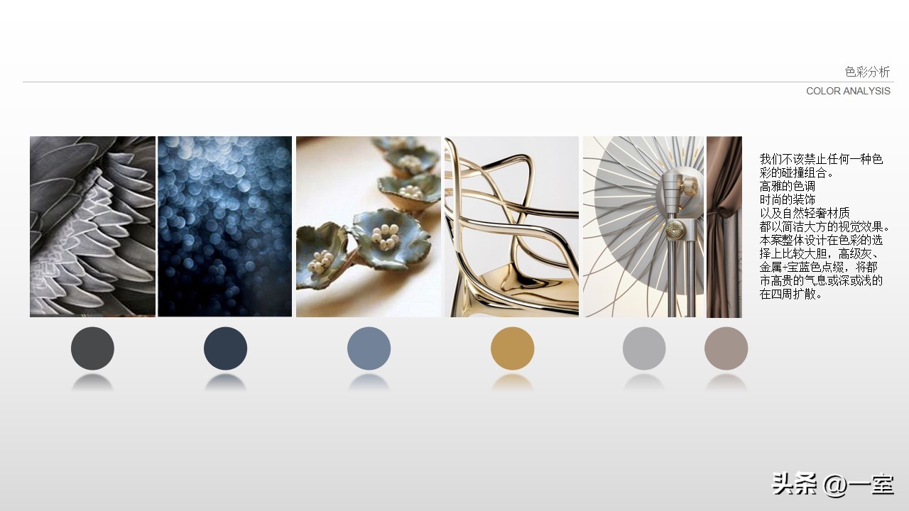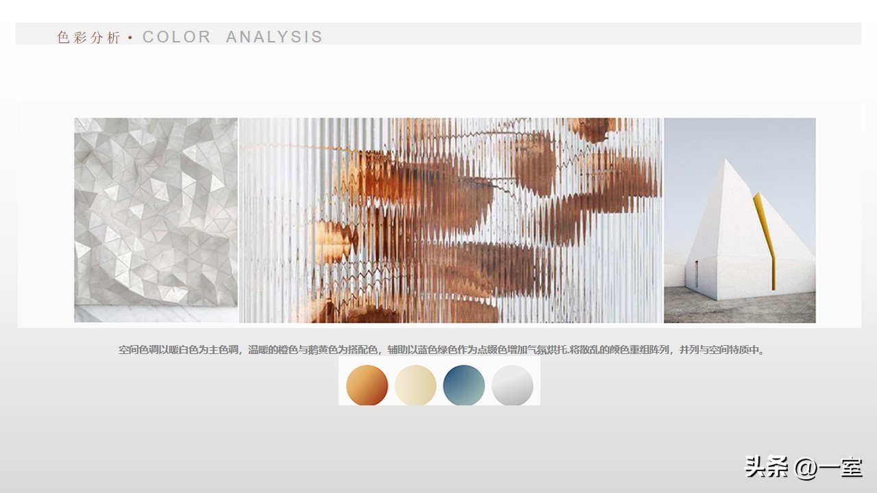 色彩分析图在PPT中也是很有必要的,有了这张图,客户能快速了解到方案的色调与色彩搭配。如果客户不喜欢这个搭配,在前期及时提出并修改,搞清楚客户的色彩意向,也有利于后期方案的继续设计。