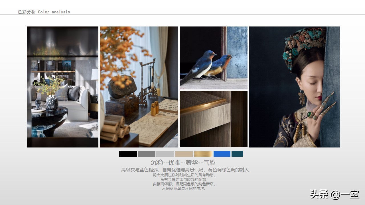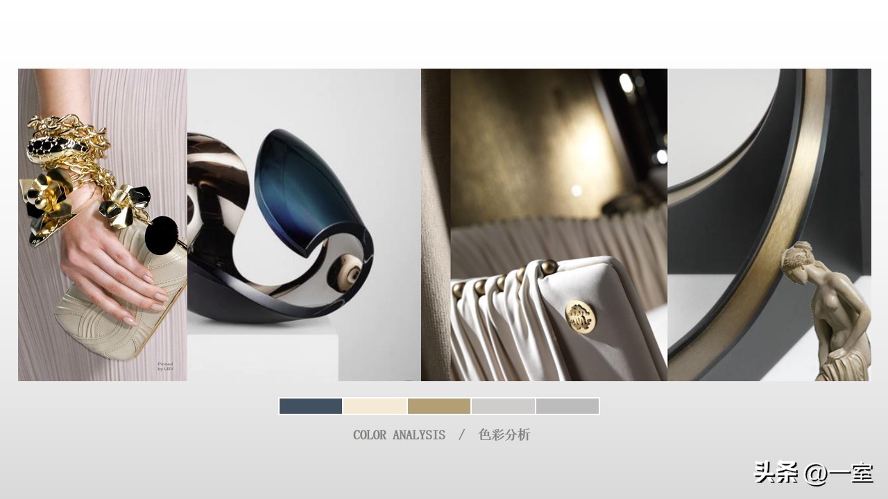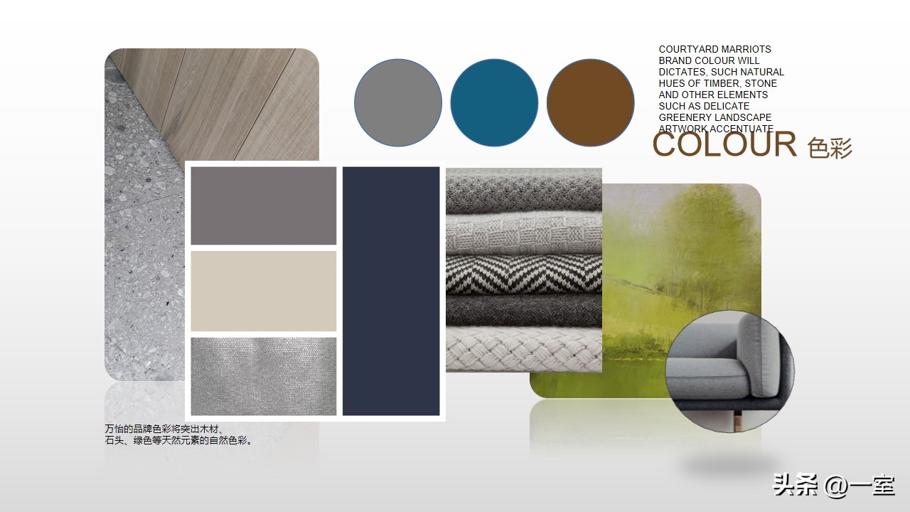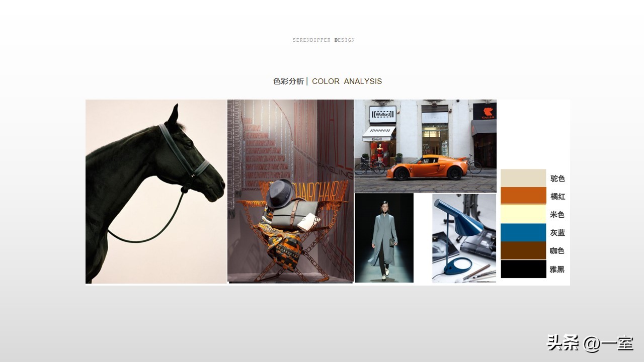 色彩分析图在PPT中也是很有必要的,有了这张图,客户能快速了解到方案的色调与色彩搭配。如果客户不喜欢这个搭配,在前期及时提出并修改,搞清楚客户的色彩意向,也有利于后期方案的继续设计。