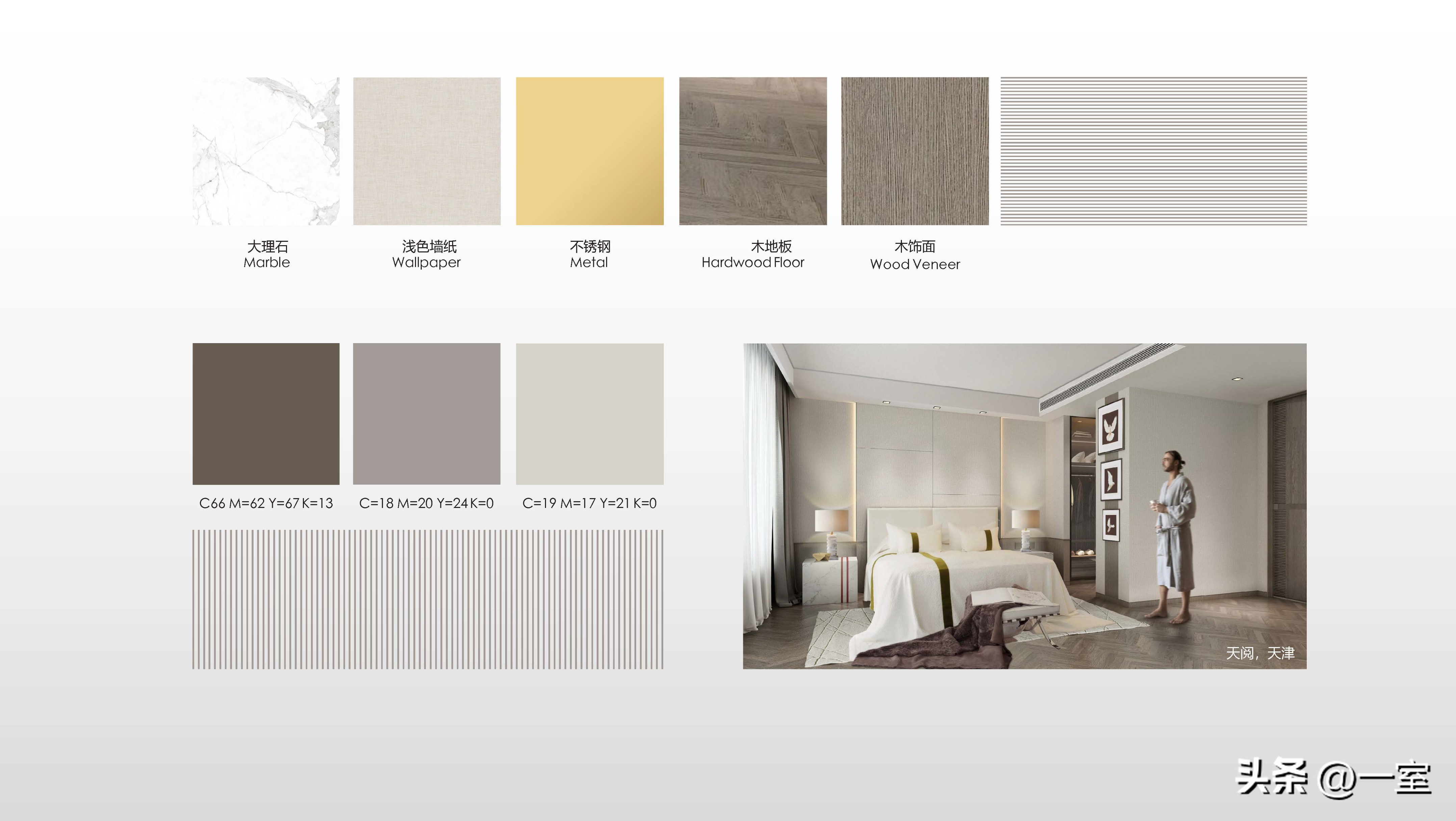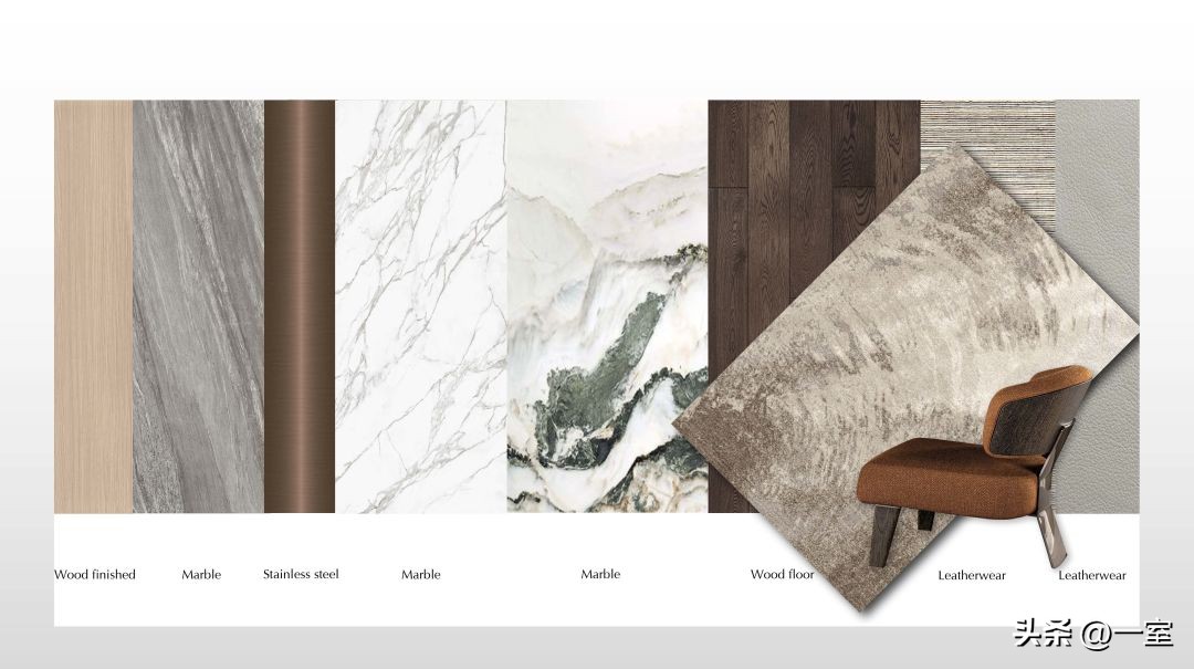 除此以外,材料也有颜色和肌理质感的展现,了解客户对材料的喜好与需求,搭配出一套最合心意的。在后期的效果图中,将这套材料展现出来;后期施工中,也能按照材料板去购买主材。