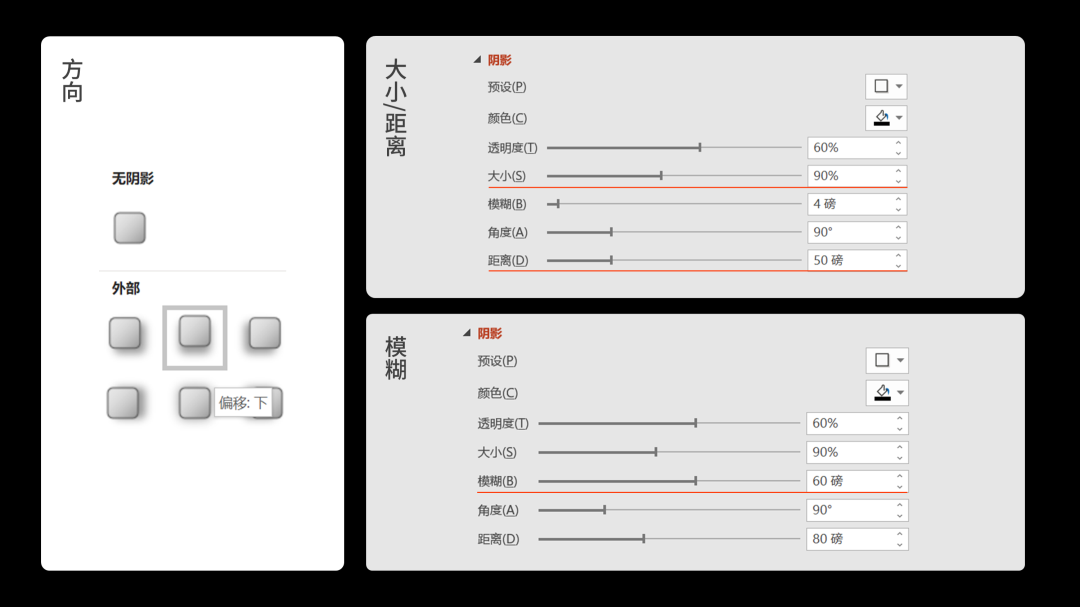 我们以阴影方向朝下来说,可以通过调整大小,距离和模糊来完成,参数如下: