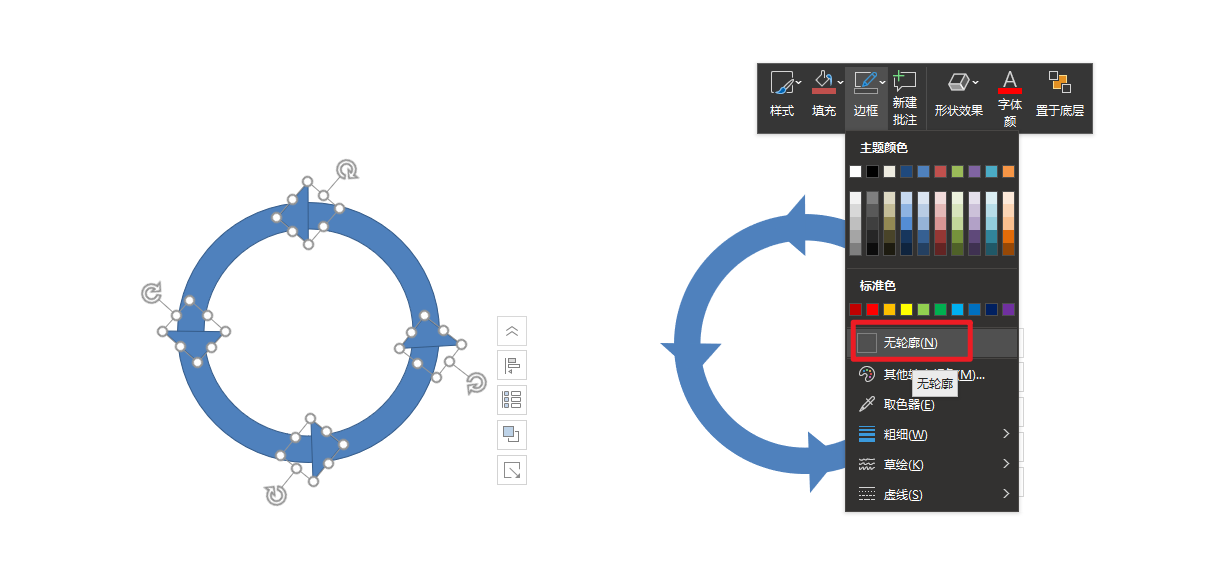 然后添加三角形在圆环中,均匀分布,并选中所有形状,边框设置为无轮廓。