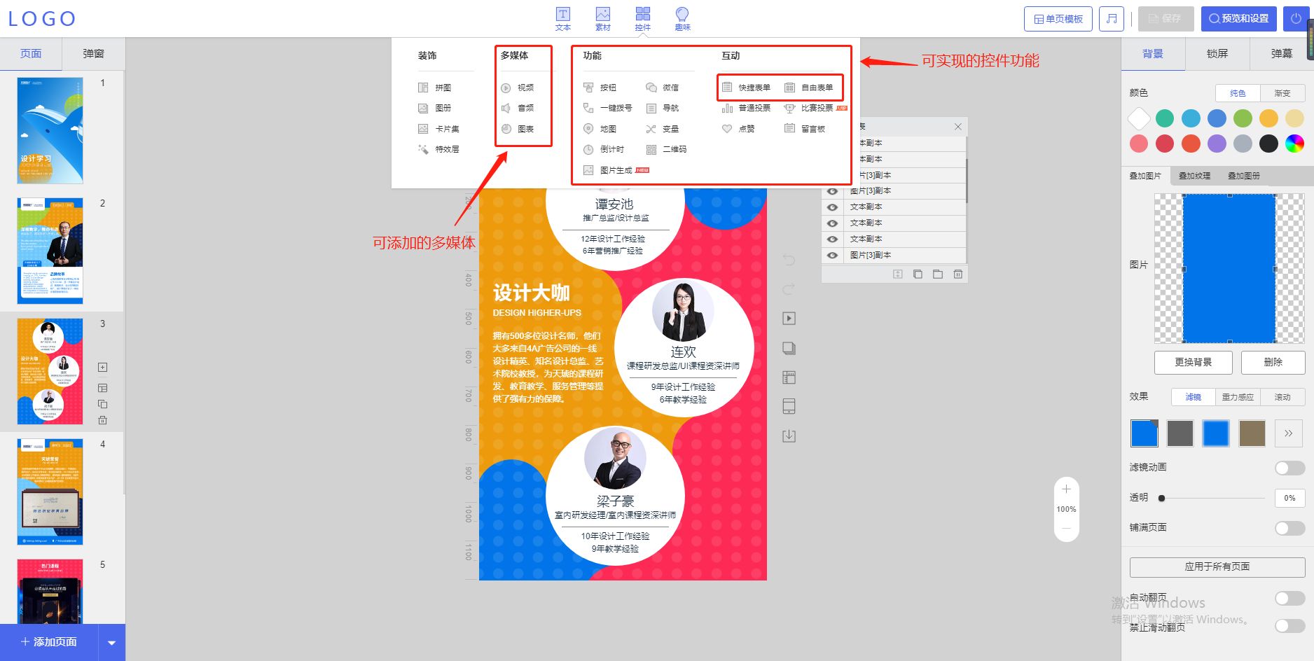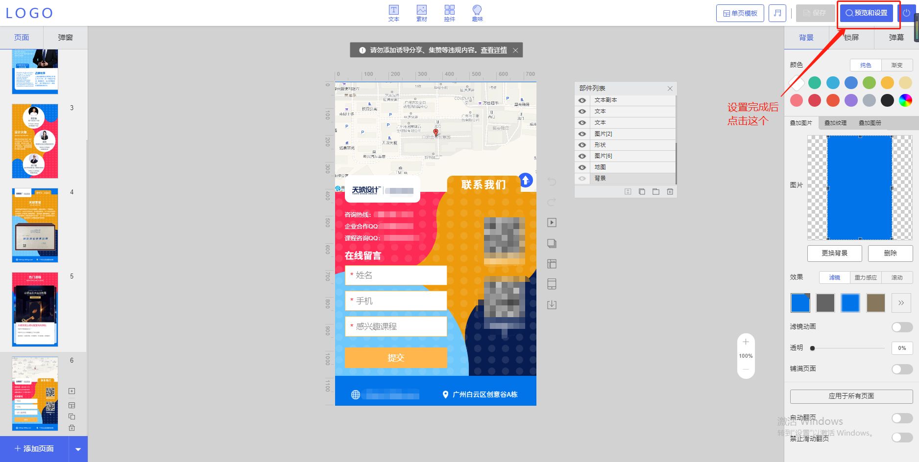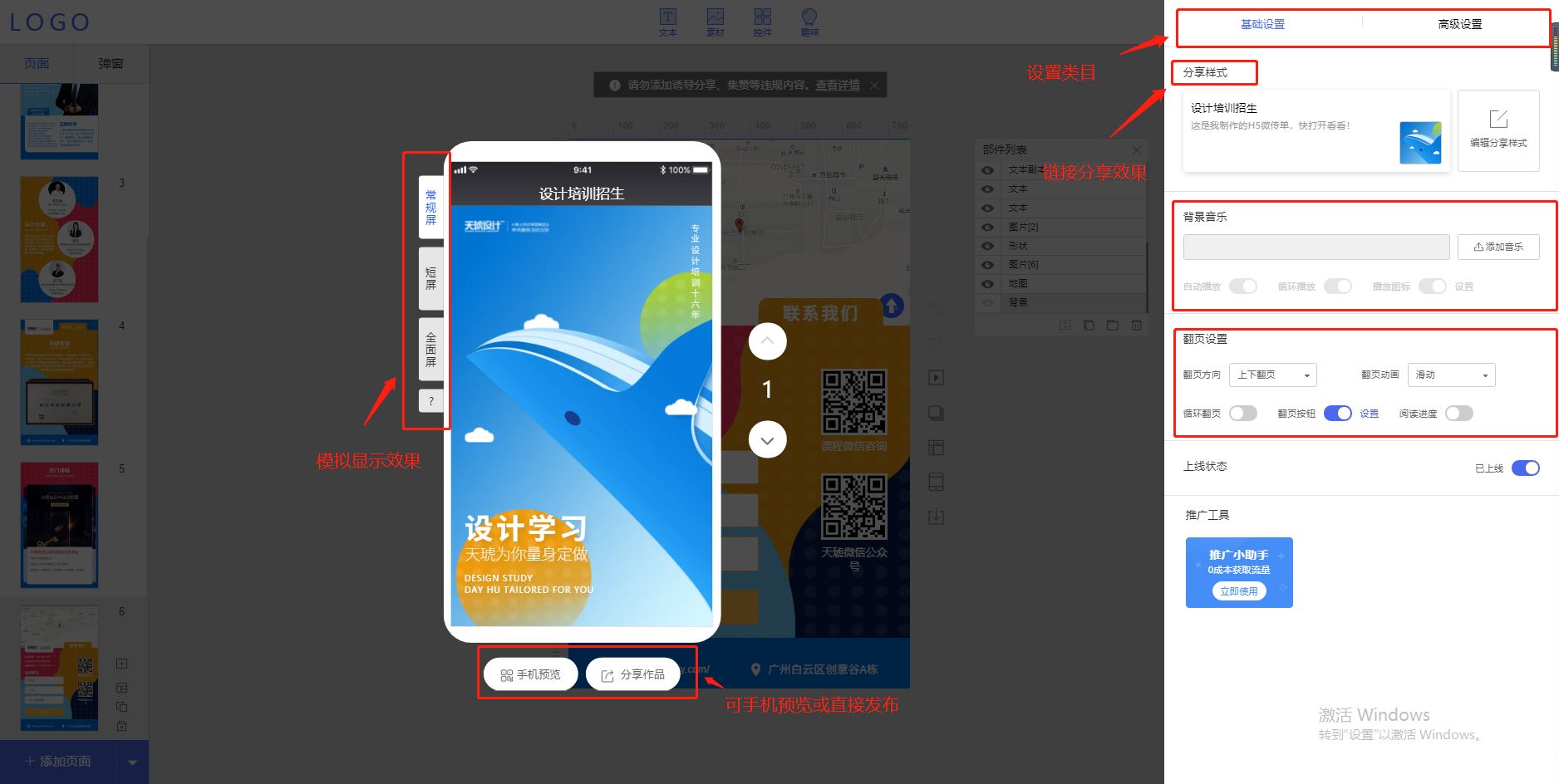 在设计完后点击右上角的预览,进行效果展示和调整,可跟换背景音乐,翻页效果等。完成后选择分享作品,就可以发布到各平台进行推广和招生了。