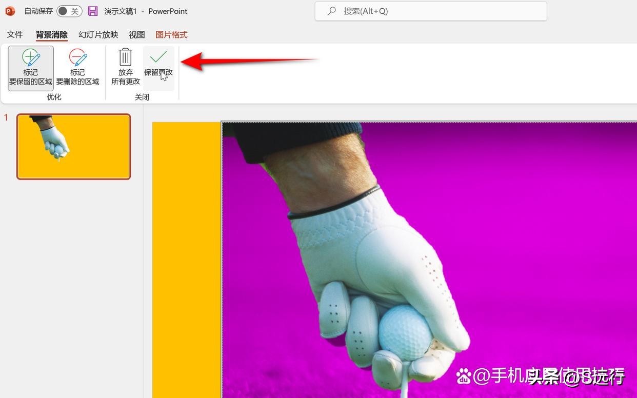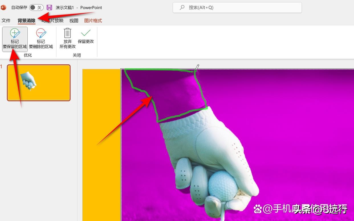 单击“背景消除”,选中“标记要保留的区域”,在图片上勾画出需要保留的区域。