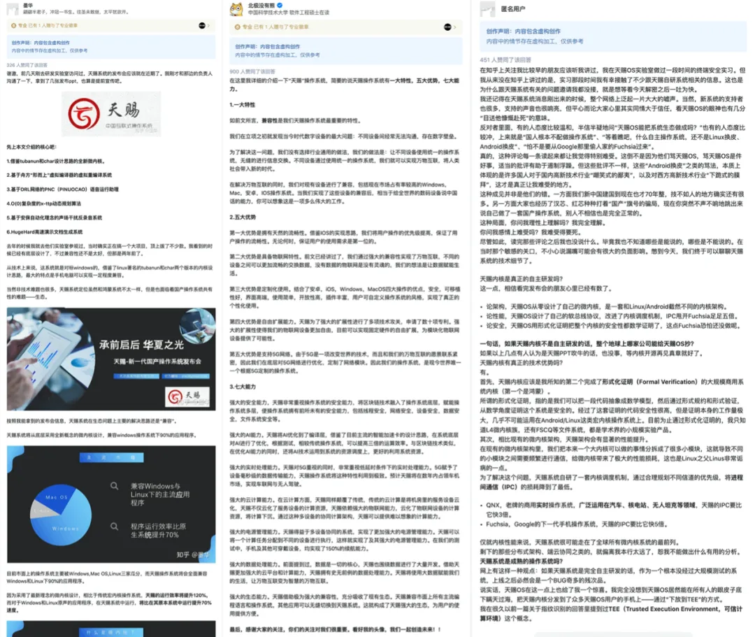 更有意思的是,这些回答帖子对该系统的技术亮点、概念塑造信手拈来,甚至为该系统做了发布会 PPT,不少回答从技术层面、生态层面、应用层面对这个系统展开了非常 “专业” 的探讨,仿佛确有其事。