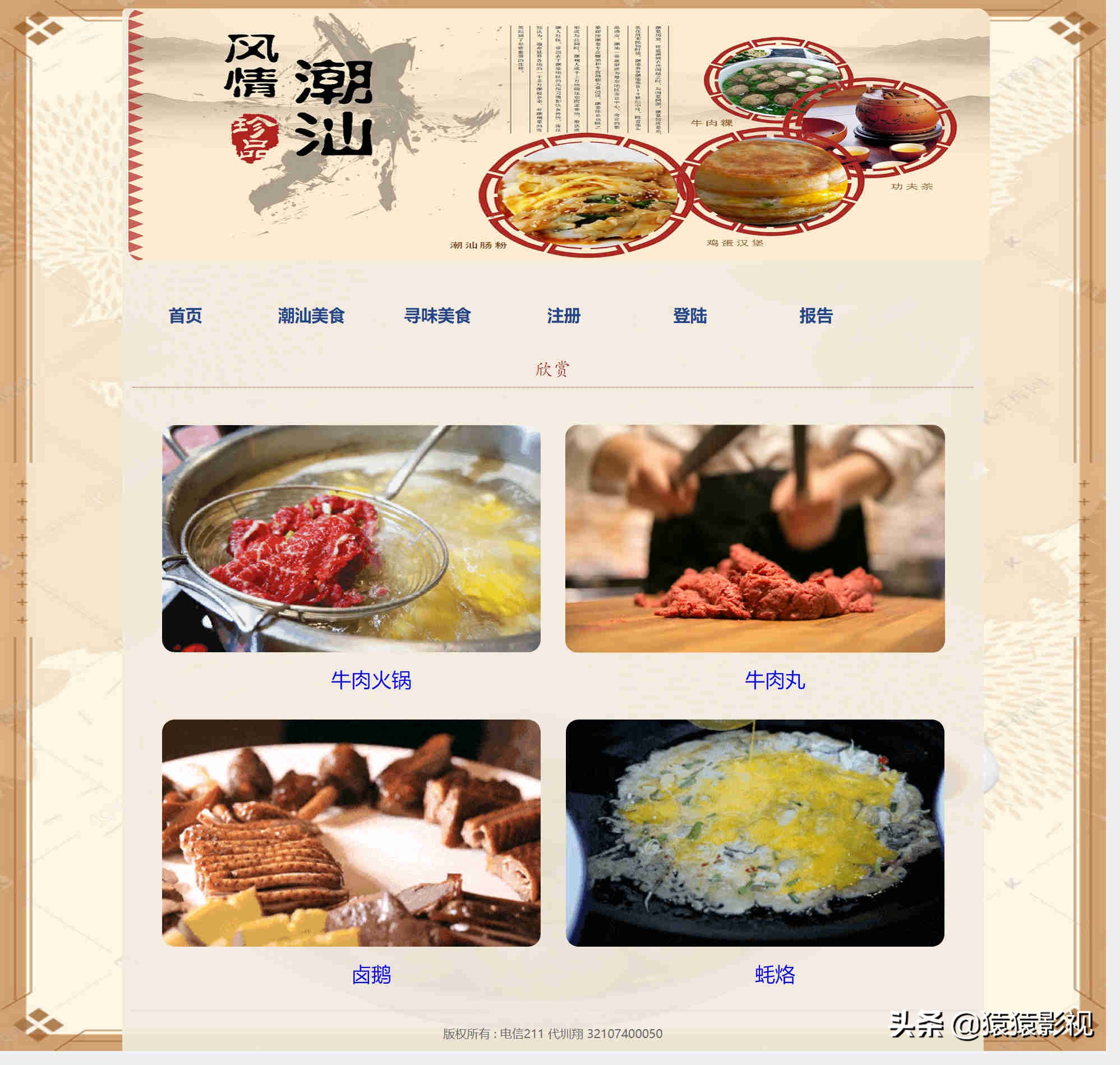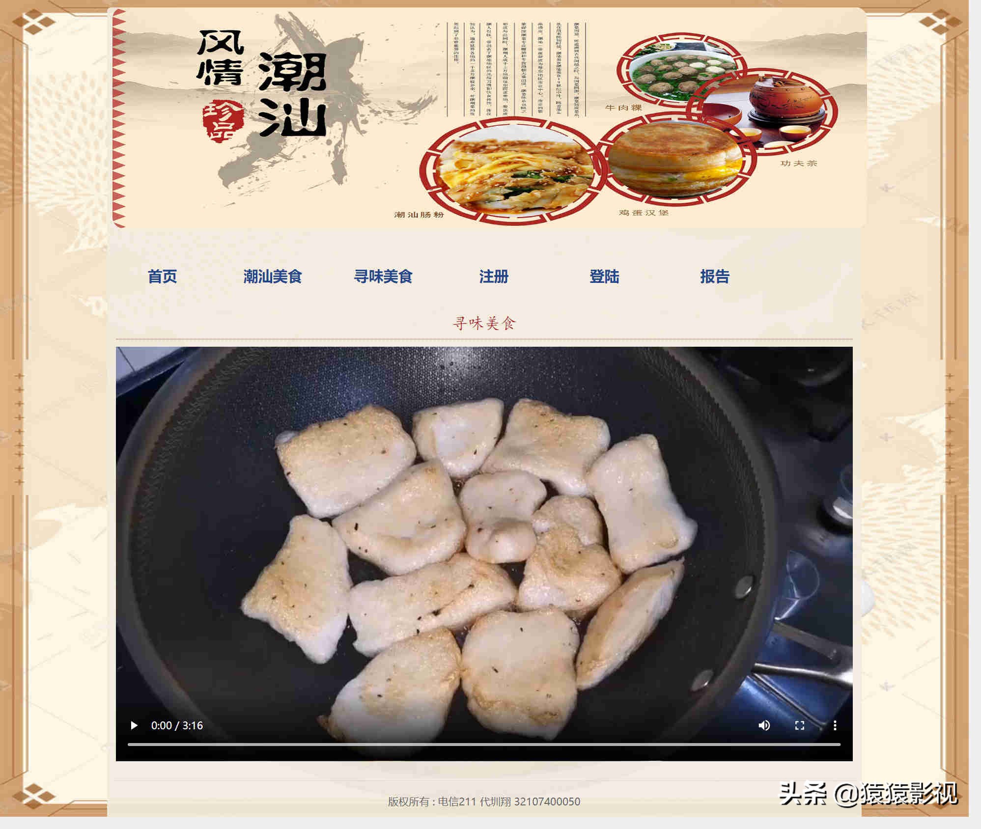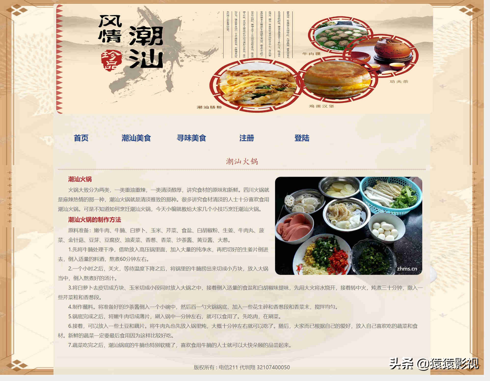 潮汕美食网页设计由6个页面组成,实现了图片轮播,视频播放,注册登录js验证。