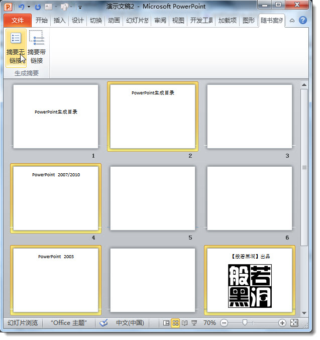 ③选中需要生成摘要的幻灯片后,单击“随书案例”菜单中的“摘要无链接”即可生成不带超链接的目录,单击“摘要带链接”则生成带有超链接的目录。