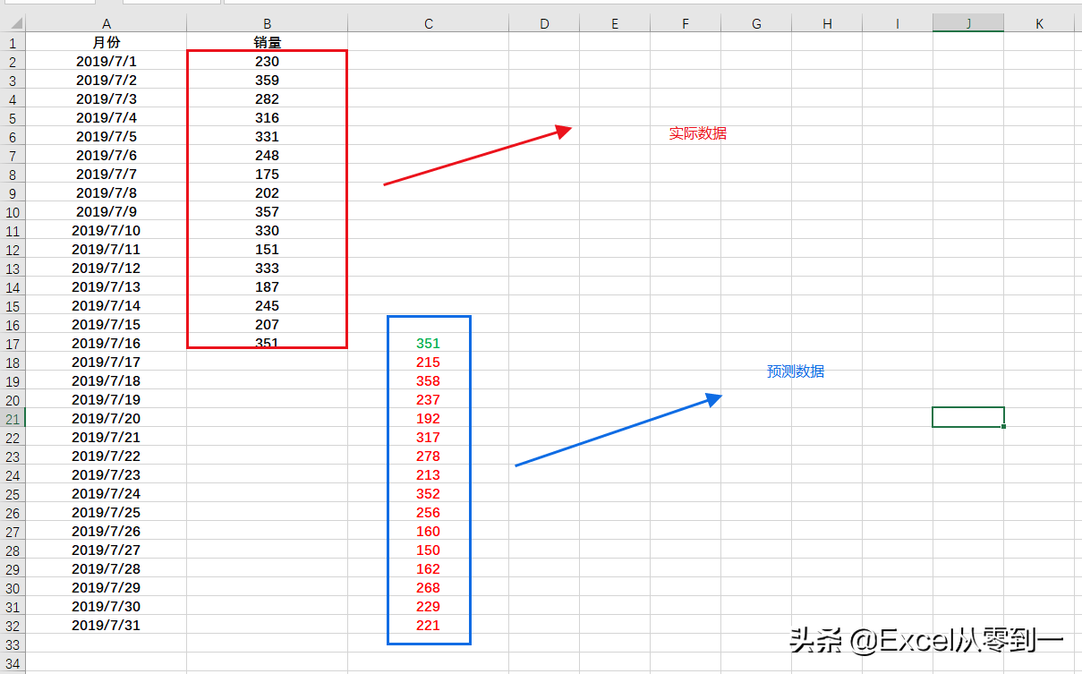 首先我们需要对数据进行,在这里我们是从17号开始预测数据的,我们需要将预测的数据放在实际数据的旁边列,然后16号的数据也需要填写上去,如果不填写16号的数据,图表就会产生断点,其实我们这么做就相当于设置了2条折线,只不过是让他们在16号这点重合罢了