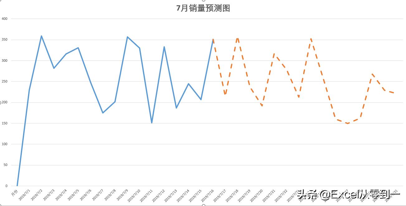 Hello,大家好,今天跟大家分享下我们如何将折线图的一部分折线设置为实线,另一部分设置为曲线,像这样的图表常用于我们对数据的预测,实线部分是实际数据,而虚线的部分是预测数据,如下图