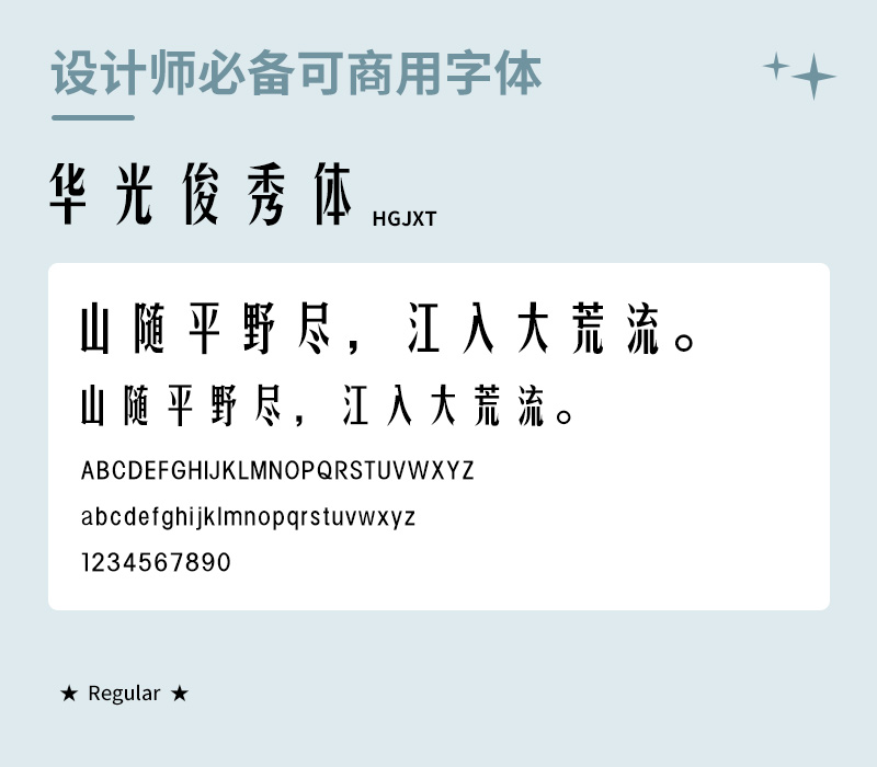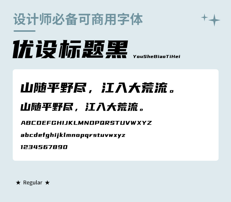 这个字体出来有几年了,因为棱角分明,还带一些倾斜,字形比较好看,在设计界还是很受欢迎的。特别适合年轻、时尚、个性、运动、科技风格的标题。