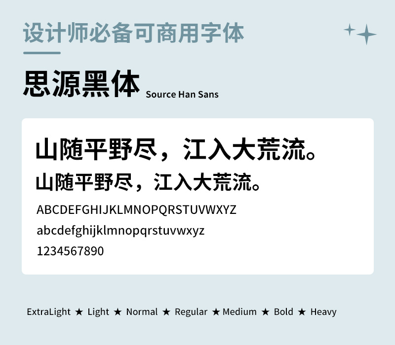 思源黑体是设计界最常用的黑体字,比起自带的黑体它显得更加饱满好看一些,是除了微软雅黑最好看的黑体字之一,微软雅黑因为不是免费字体,所以它就成了最好的替代品。