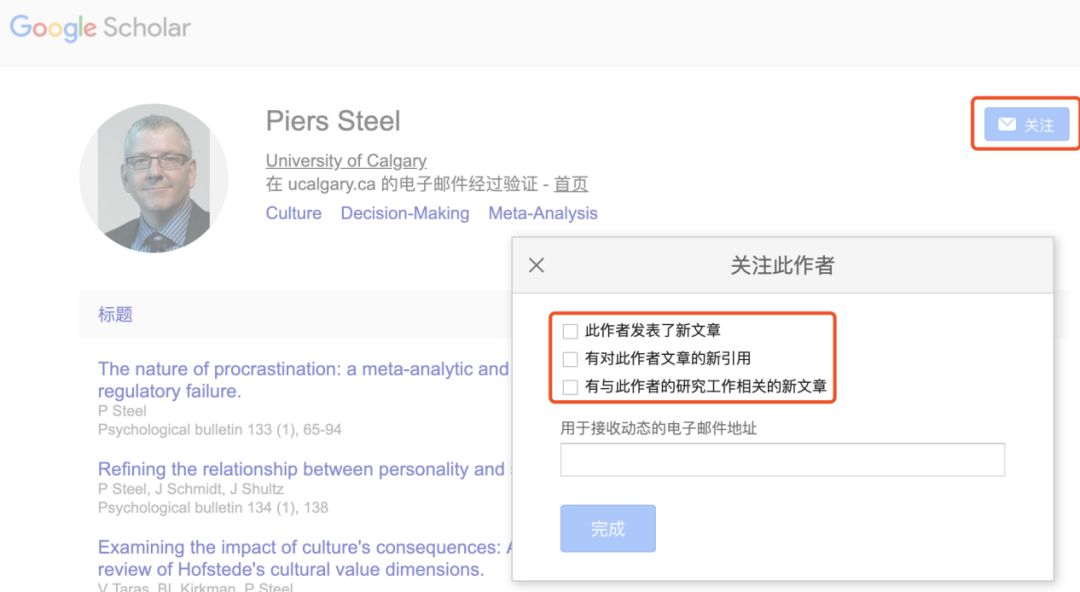 作为一个学术网站,Google Scholar提供的服务还是很贴心的,大家可以在作者的Google Scholar界面的右上角点击关注,然后就会有个小窗弹出,可以选择接收三种关于该作者的动态,比如“此作者发表了新文章”、“有对此作者文章的新引用”,或者“有与此作者的研究工作相关的新文章”,选中你需要的选项,然后在下面的框里填入自己的邮箱,只要上面这几项有新的信息,邮箱都会收到提醒,是不是很方便呢?