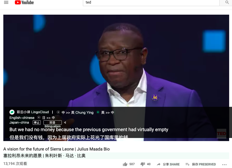 直接上演示看疗效吧,这是油管的一个TED演讲视频,刚打开是这样一个全英文演讲,啥字幕也没有: