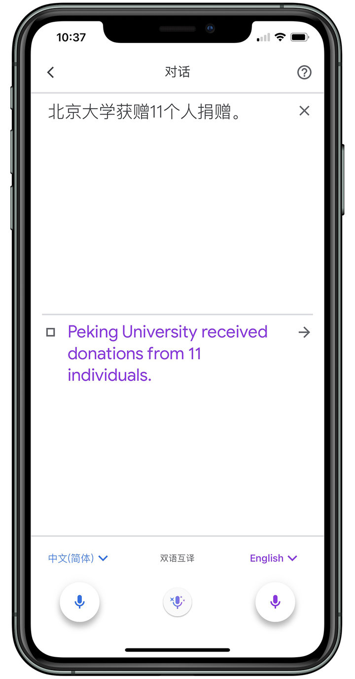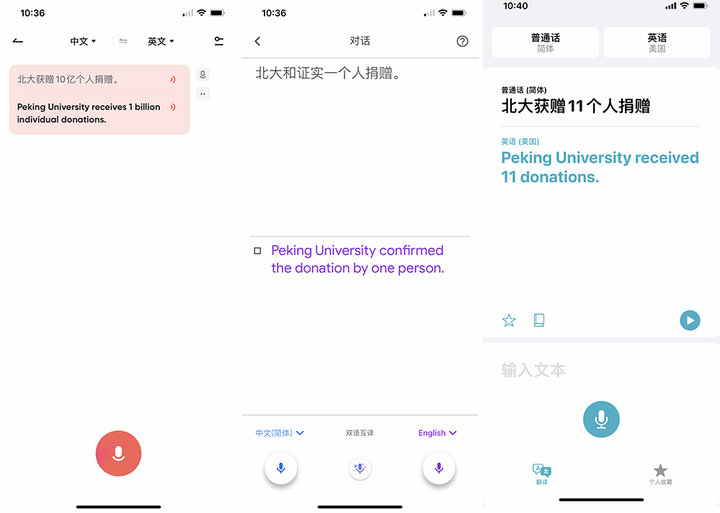 在翻译过程中,有道词典顺利完成翻译任务,而 Google 翻译和苹果翻译都无法得到正确答案。特别是 Google 翻译,普通话一级乙等的我,不论说的再慢、再清晰,它的识别都相当离谱。我只好将句子改为「北京大学获赠十亿个人捐赠」,虽然识别没有问题,但依然没有得出正确答案。