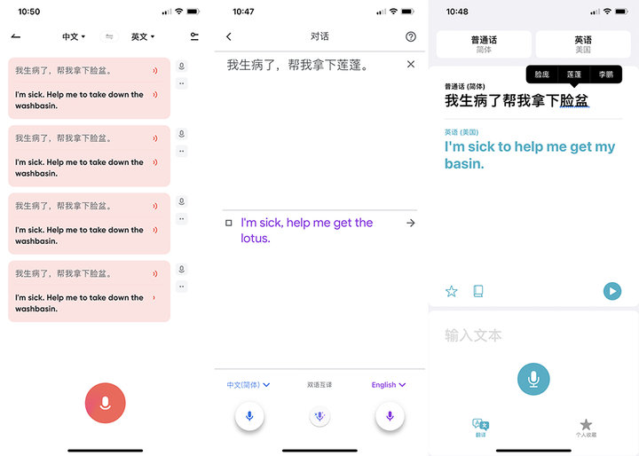 在本轮测试中,我重复了多次以达到准确的结论。其中,有道词典基本没有出现错误;Google 将「脸盆」识别为「莲蓬」、「脸庞」、「脸头」,没有一次识别成功;苹果翻译识别率也很高,还标注出了发音不确认的词,并提供了备选词语。
