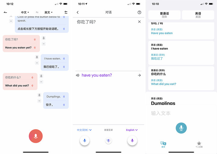 除了上面提到的这些功能,三者在界面展示上也各有特色,有道词典会将对话的双方分列在界面两侧,如同聊天软件一般,方便用户查看;Google 翻译则无法查询对话历史,如同一个实时翻译,且不论你说的是哪国语言,显示的顺序都不会调整;而苹果翻译则通过历史记录的形式进行对话展示。总的来说,有道词典的对话翻译功能,更加符合「对话」的逻辑。