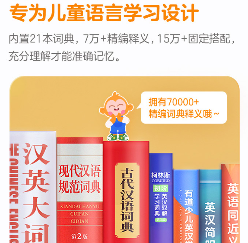 另外,网易有道词典笔3.0的“优良传统”之一离线查询功能也得到保留,网易有道儿童词典笔内置了21本专业词典,涵括了7万+的精编释义、15万+固定理解,足够满足儿童学习英语的需求了。