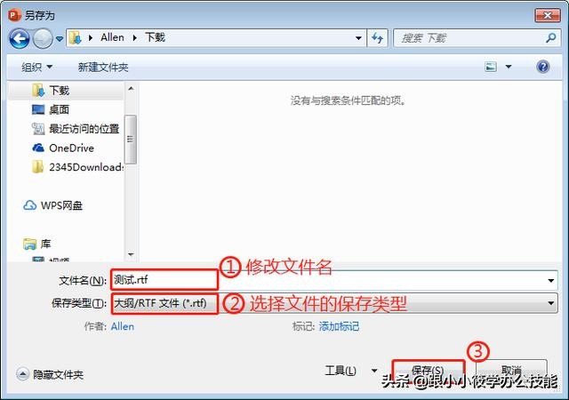 第一步按F12键之后弹出“另存为”对话框 --输入保存后的文件名 --“保存类型”选择“大纲/RTF文件(*.rtf)”-- 点击“保存”按钮。