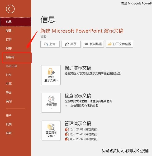 打开要转换的PPT,按F12键另存为其它格式的文件。(或者直接点击左上角“文件”-- 点击“另存为”)。