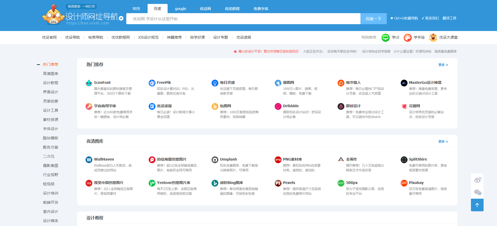 3、优设网导航:https://hao.uisdc.com/。国内网页设计知名网站优设网做的导航,非常不错,推荐收藏