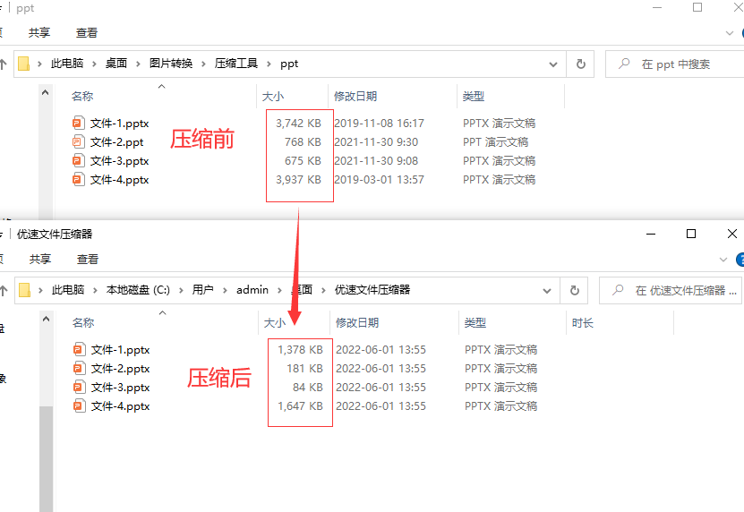 第4步,我们将压缩后的ppt与原文件进行对比,可以看到,压缩后的ppt文件明显要比压缩前小很多。