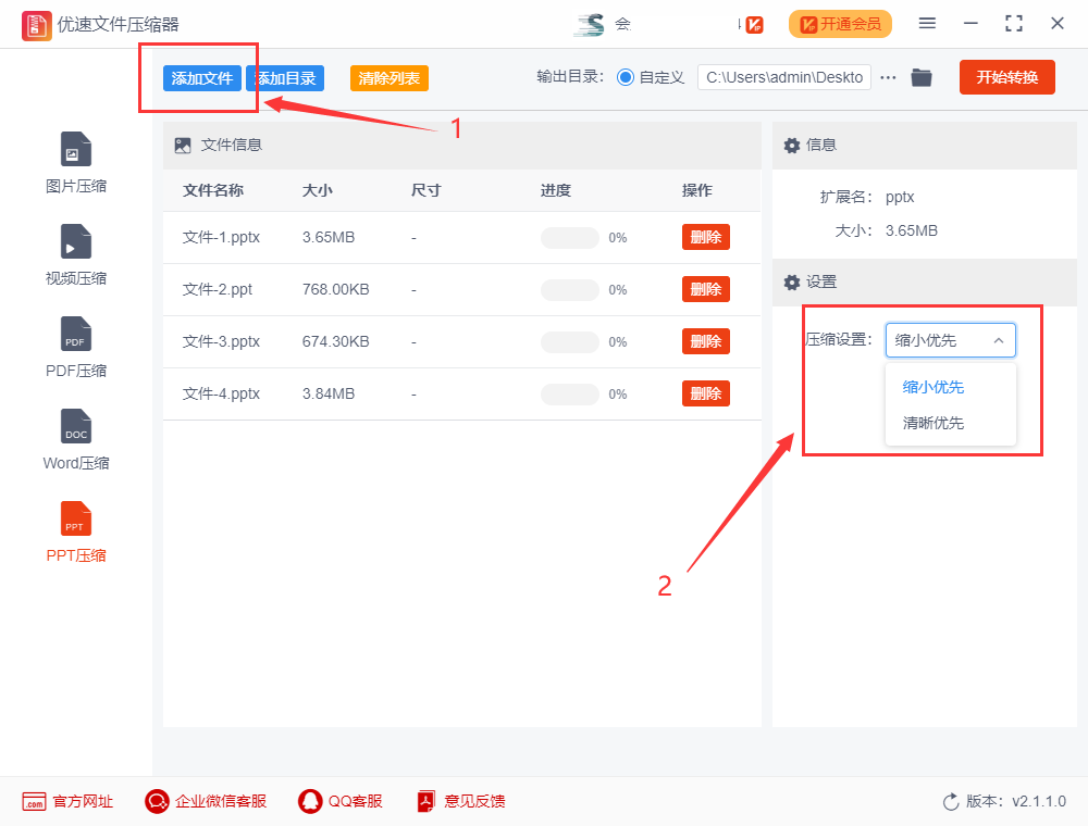 第2步,点击左上角的【添加文件】按钮,将需要压缩的ppt文件添加到软件中,可以批量导入批量压缩,提高压缩效率;然后进行压缩设置,选择一种压缩方式,默认为“缩小优先”。