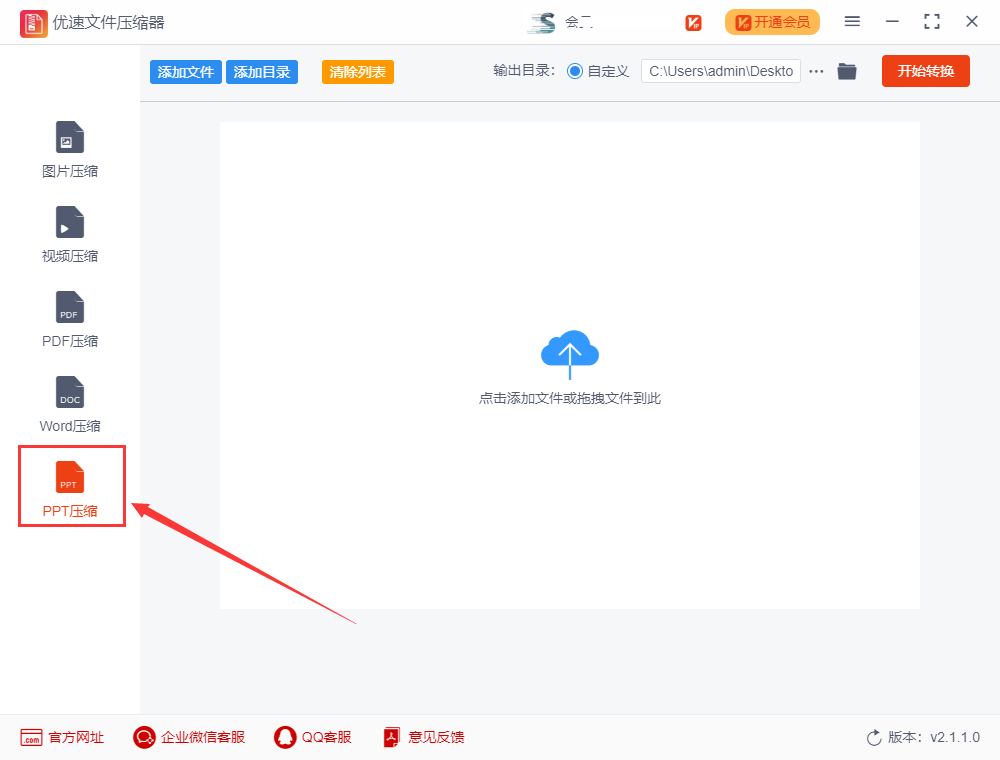 第1步,打开电脑后下载“优速文件压缩器”工具软件,安装好之后打开使用。软件支持五种常见文件的压缩,我们点击【PPT压缩】功能进入下一步操作。