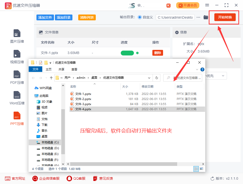 第3步,最后就可以点击【开始转换】按钮启动压缩了,当添加的ppt文件压缩完成后,软件会自动打开输出文件夹,所有压缩后的ppt文件就保存在里面。
