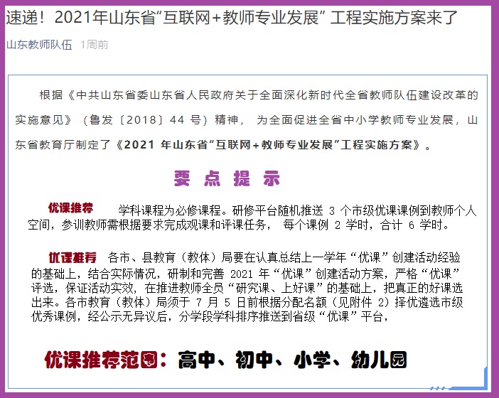 近几年,山东省“互联网+教师专业发展”工程和优课推荐工作是从幼儿园到高中,全学段,因此,幼儿园教师也要上传优课。