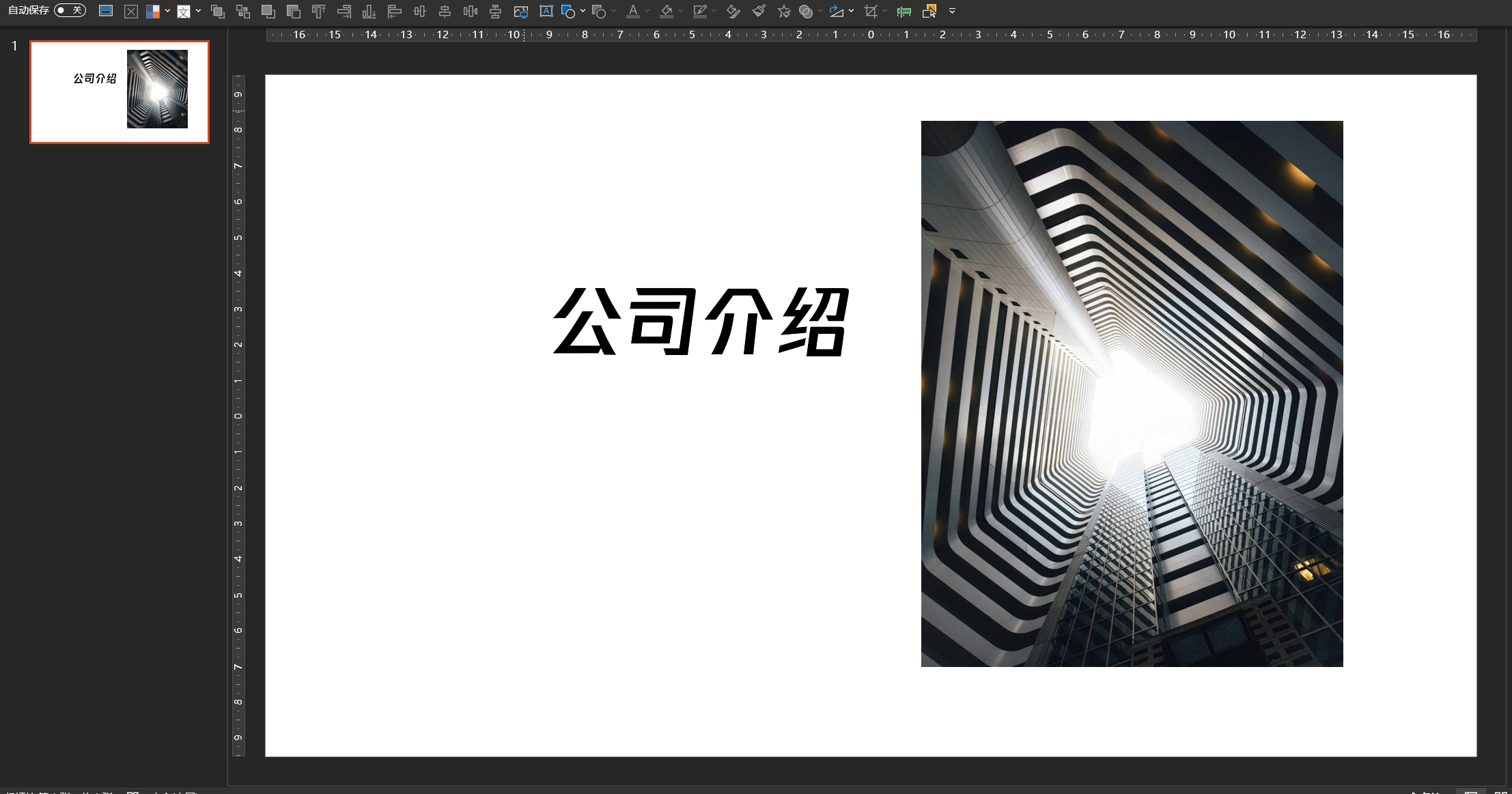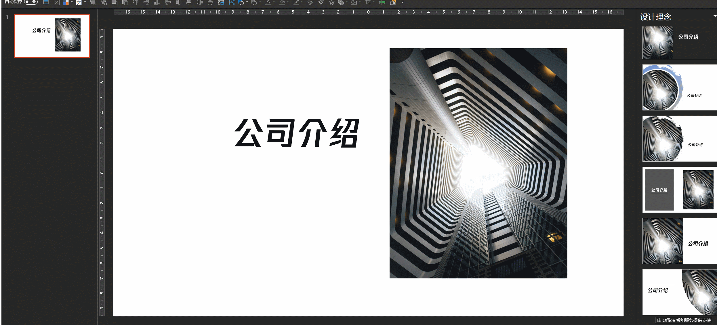 写上了文字公司介绍以及放上了公司的图片,这时候PPT便可以帮助我们自动完成排版: