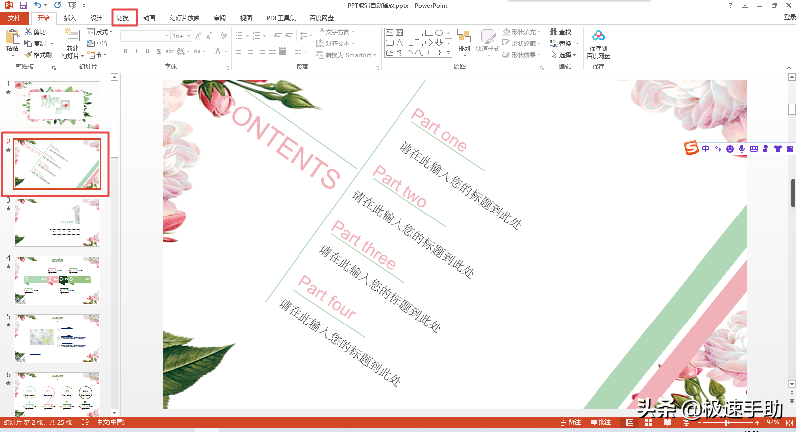 第一步,打开自己已经编辑好的PPT文档,进入到文档的主界面当中后,我们选中一张需要进行设置的幻灯片,找到软件界面顶部菜单栏上的【切换】选项卡,并点击进入。