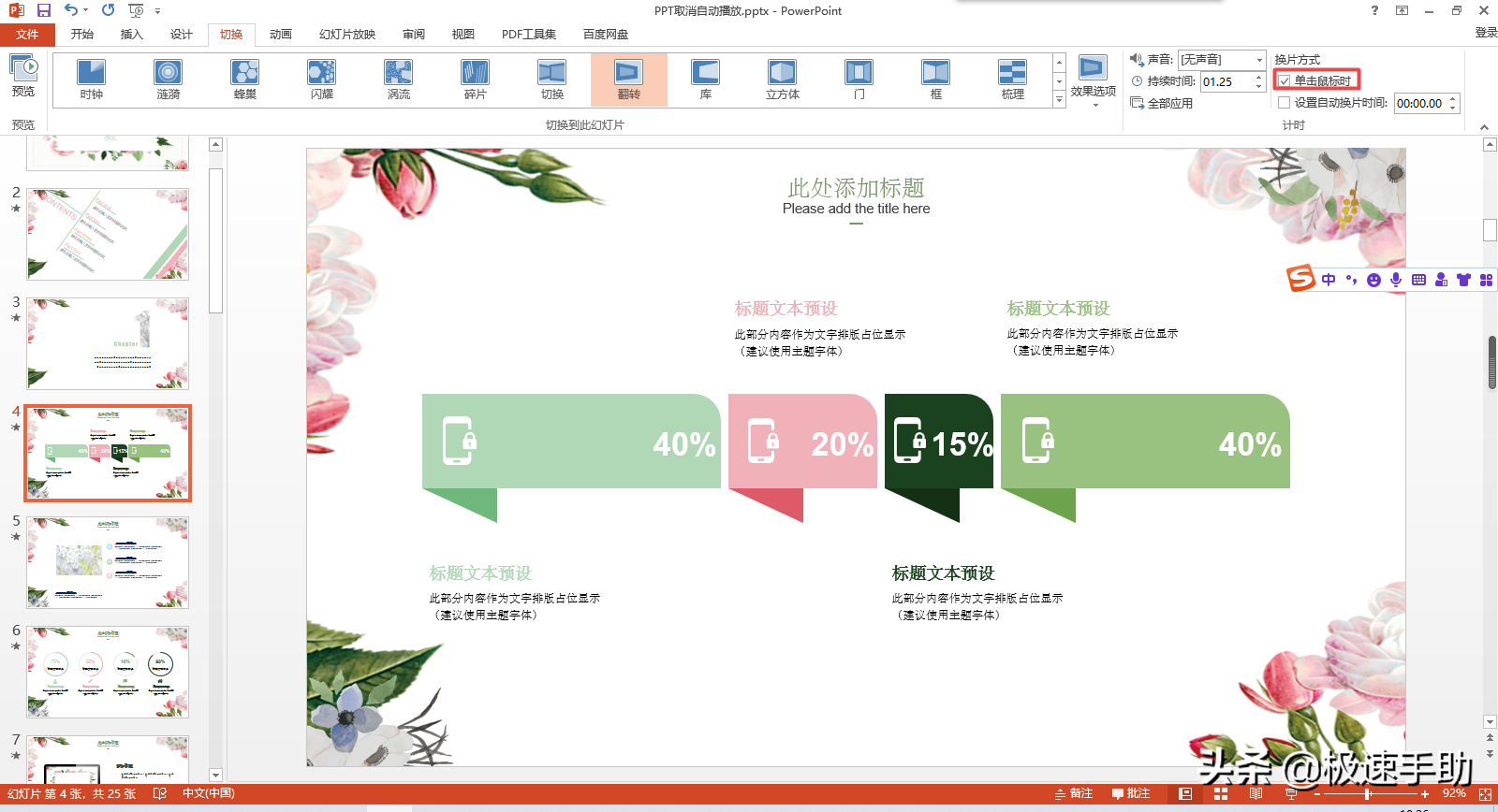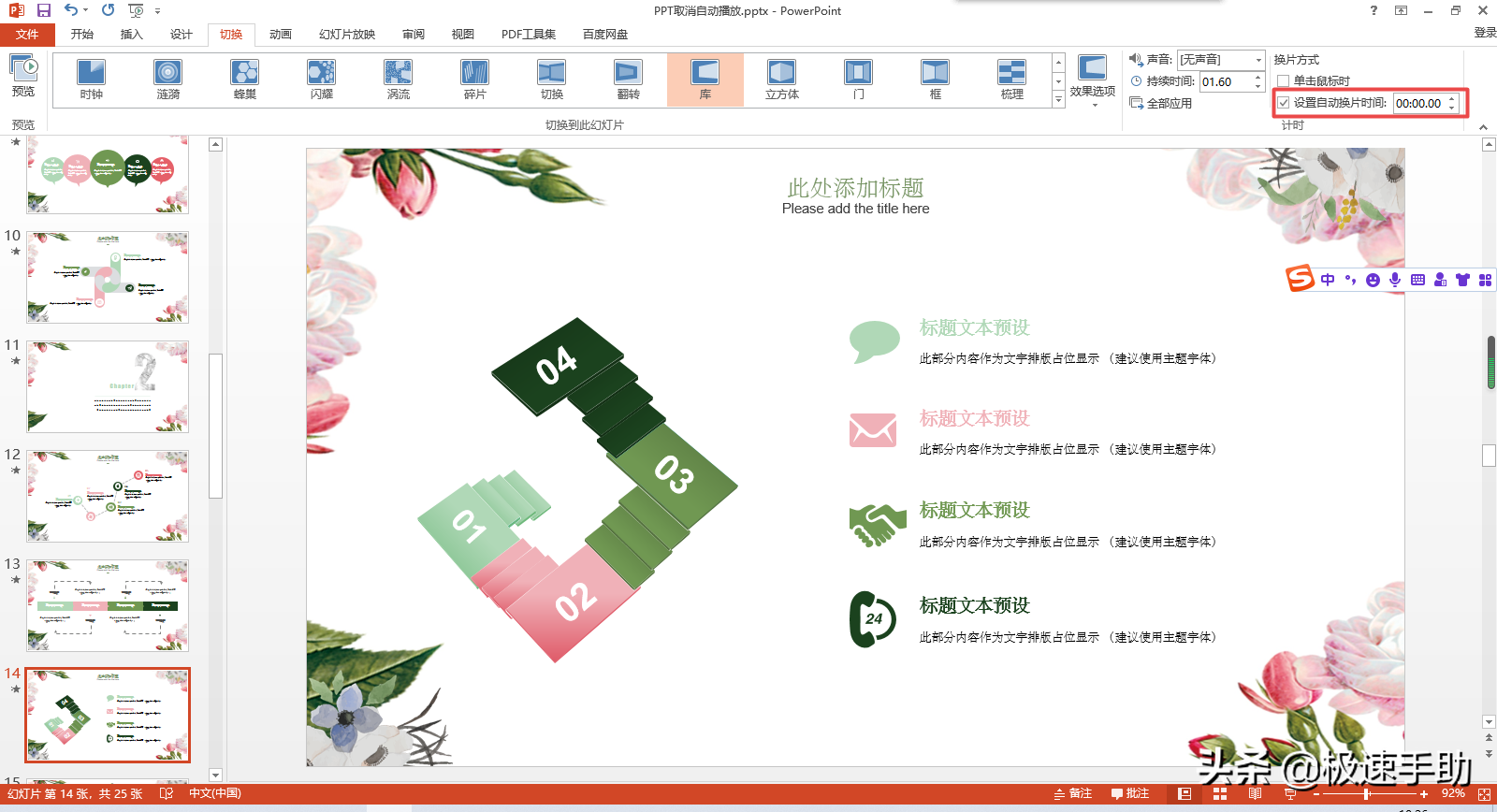 好了,这就是为大家总结的关于PPT自动播放功能的取消方法了,如果你平时在编辑现有的PPT模板或自己制作PPT演示文档时,也有这样的需求的话,那么不妨赶快跟着本文来将取消自动播放功能的方法学到手吧,这样一来幻灯片的进度全由你自己掌控。