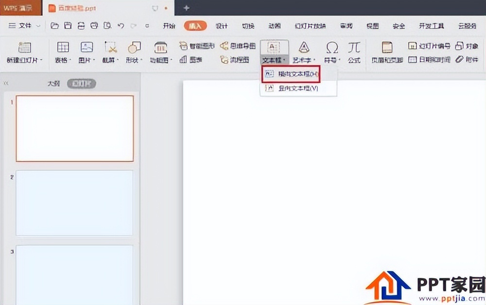 1.打开一个需要设置文本框线条颜色的ppt,选择菜单栏“插入”中的“文本框--横向文本框”