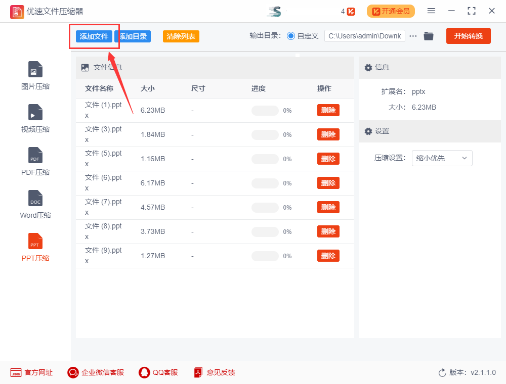 步骤二:打开软件后,大家都会观察软件的各个功能按钮,不难发现在软件的左上方有一个【添加文件】按钮,大家点击这个按钮,可以上传要压缩的所有PPT文件。