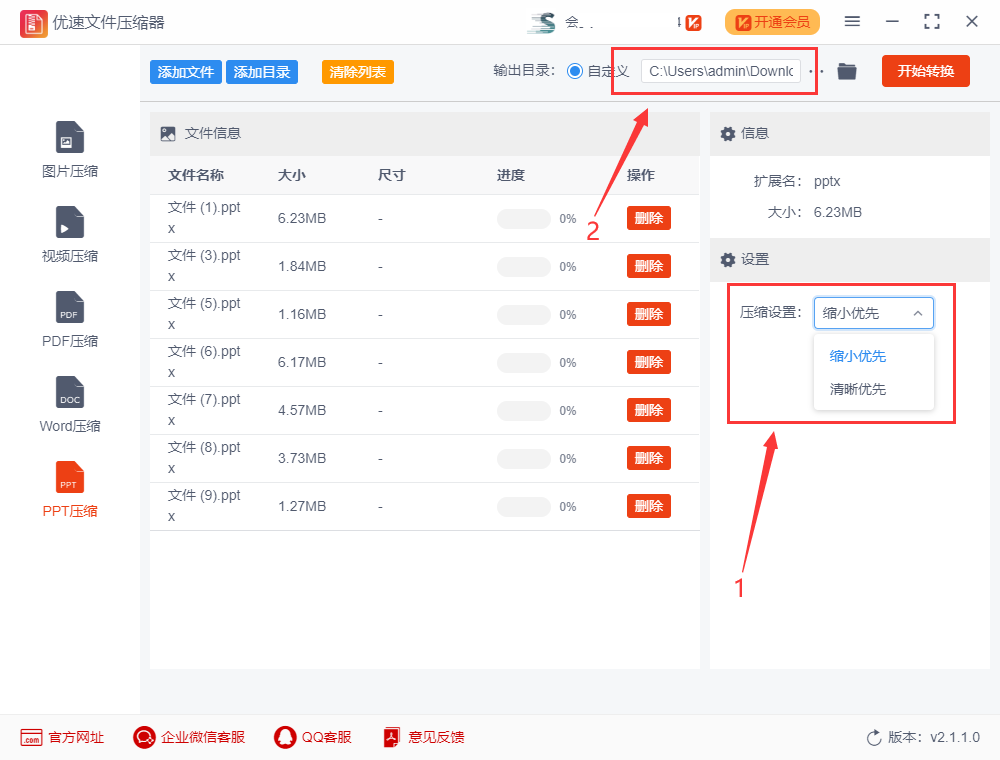 步骤三:为了进一步满足用户的具体需求,软件分别为大家设计了“缩小优先”和“清晰优先”两种压缩设置,所以压缩前用户要选择其中的一个,软件会按照这个选择标准进行压缩;然后设置输出目录文件夹,作为压缩后PPT文件的保存路径。