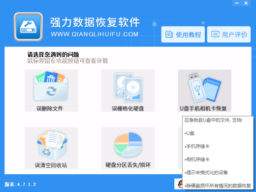 3.运行强力数据恢复软件(http://www.cjxz.com/softs/79748.html),进入软件的主界面, 选择和本次即将恢复的U盘文件相对应的功能“U盘手机相机卡恢复”。注:在数据恢复前请用户不要再操作删除文件所在的磁盘分区,防止数据覆盖,以便更好的更有效的恢复数据。