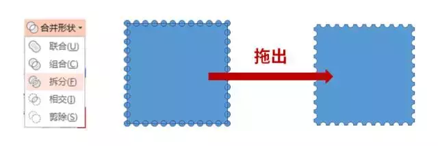 ❷ 全选所有图形元素,点击【格式】—【合并形状】—【拆分】,鼠标左键将中间部分拖出来,邮票已经制作好了!