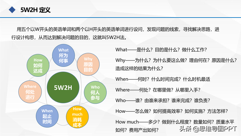 解决不遗漏的工具有很多,比如逻辑树、5Why分析法,5W2H分析法、5M1E分析法等,今天我们分享后两个,即5W2H分析法、5M1E分析法。