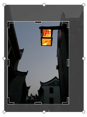 图片裁剪后,还可再次单击"裁剪"按钮,返回图片裁剪状态。此时可以看到原图分成了被裁剪区域和保留区域两个部分,被裁剪部分显示为半透明的灰色。此时,还可以操作原图的8个大小控制点及其旋转控制点,因此,仍然可以对原图进行移动、缩放、旋转操作,以调整保留区域的状态。