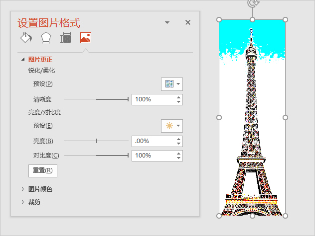 步骤01:选中图片,在"图片更正选项"中,将图片的清晰度、对比度均调整为100%。