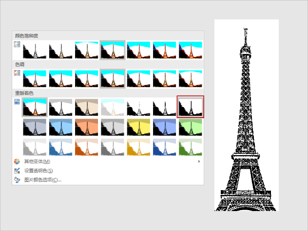当一页幻灯片中配有多张图片时,由于图片明度、色彩饱和度差别很大,无论如何排版整页幻灯片还是显得凌乱不堪。此时我们可以利用图片"格式"选项卡"调整"工具组中的"颜色"按钮,对所有图片重新着色,将其统一在同一色系下。