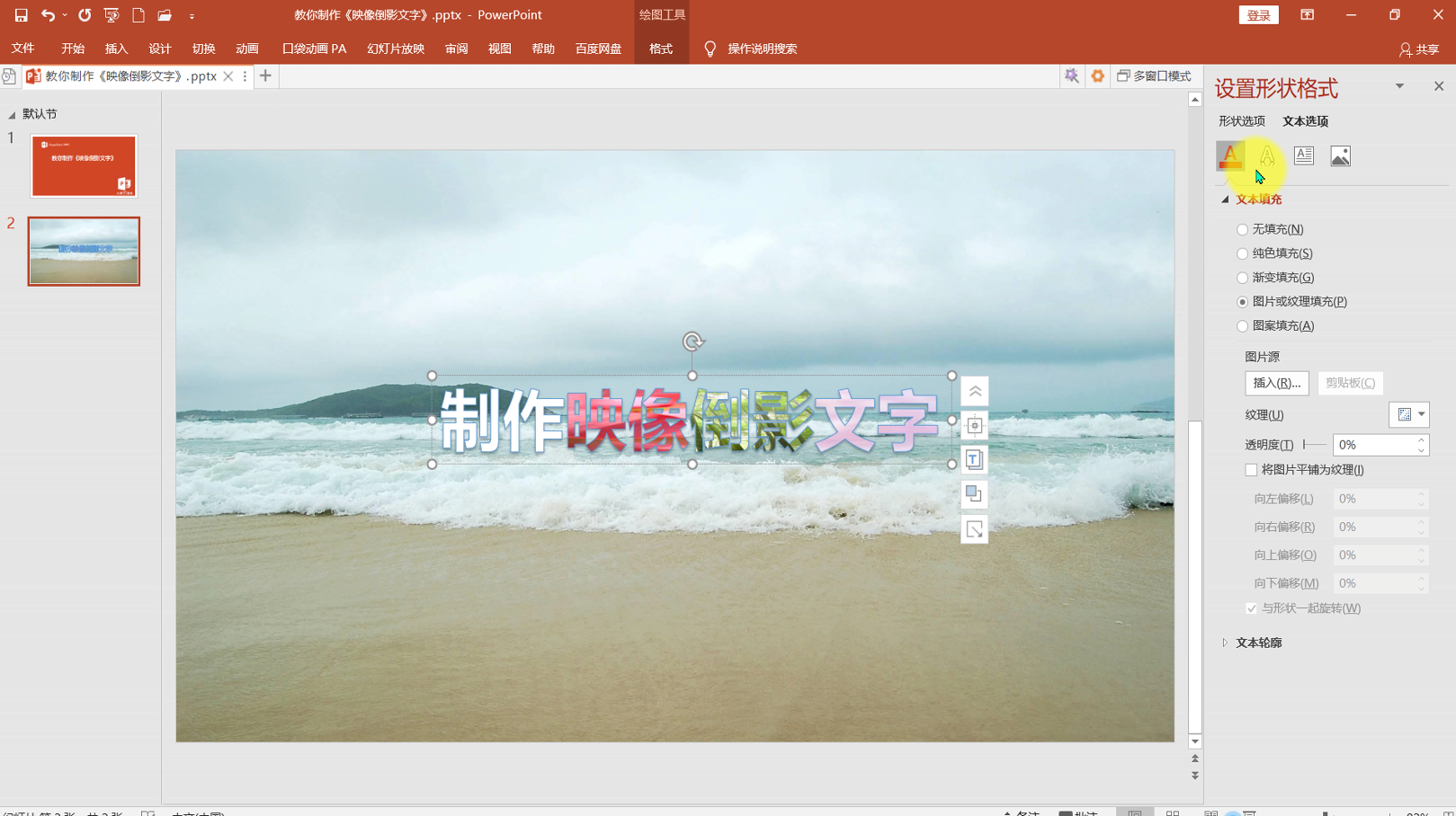 选中《倒影》内容,选择“文本选项”,点击图片或纹理填充,选择图片源插入,从文件中选择一张图片。