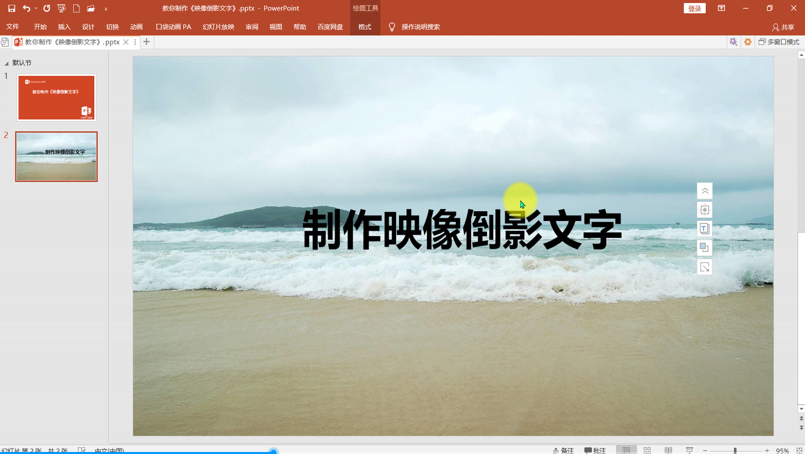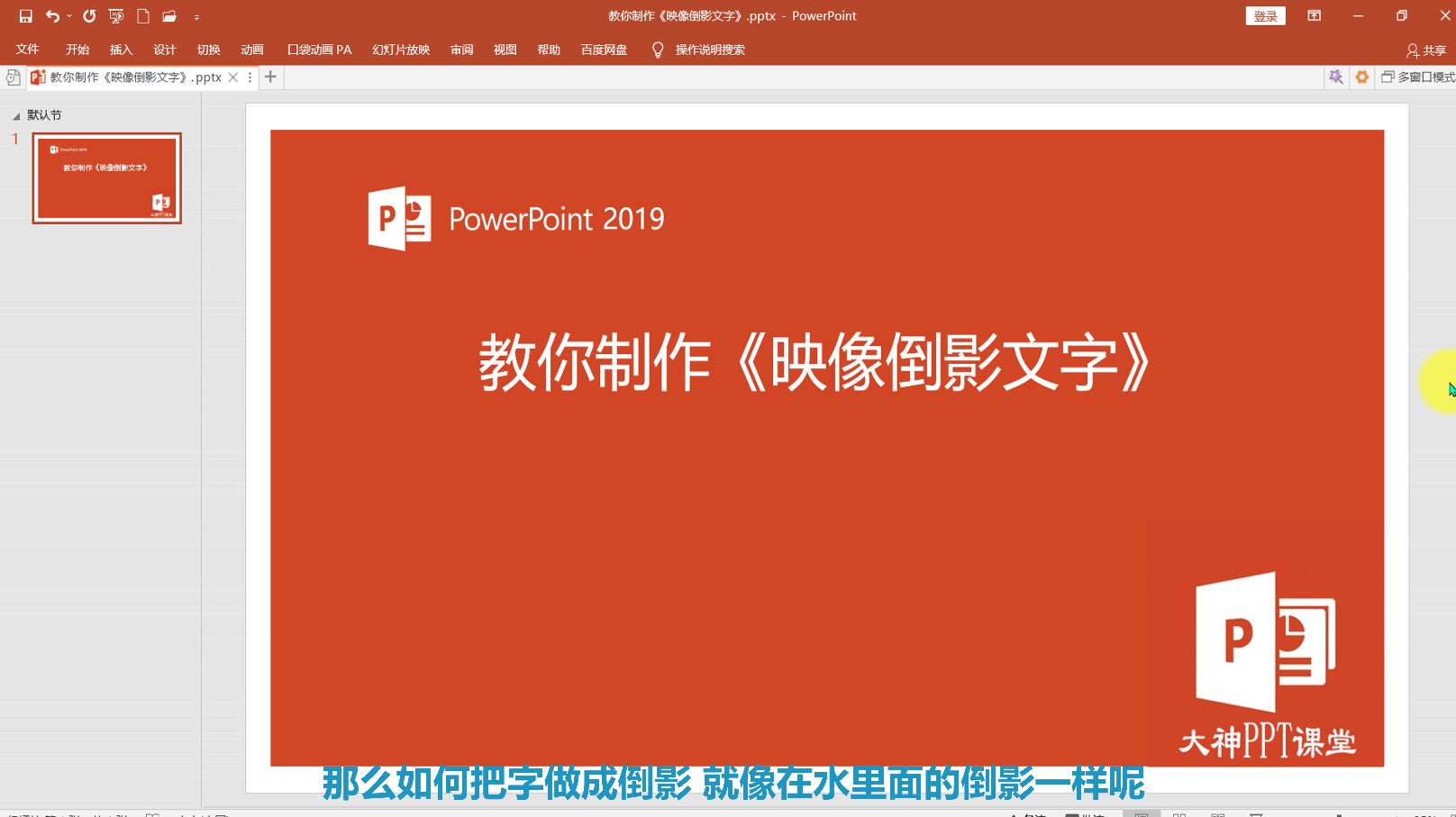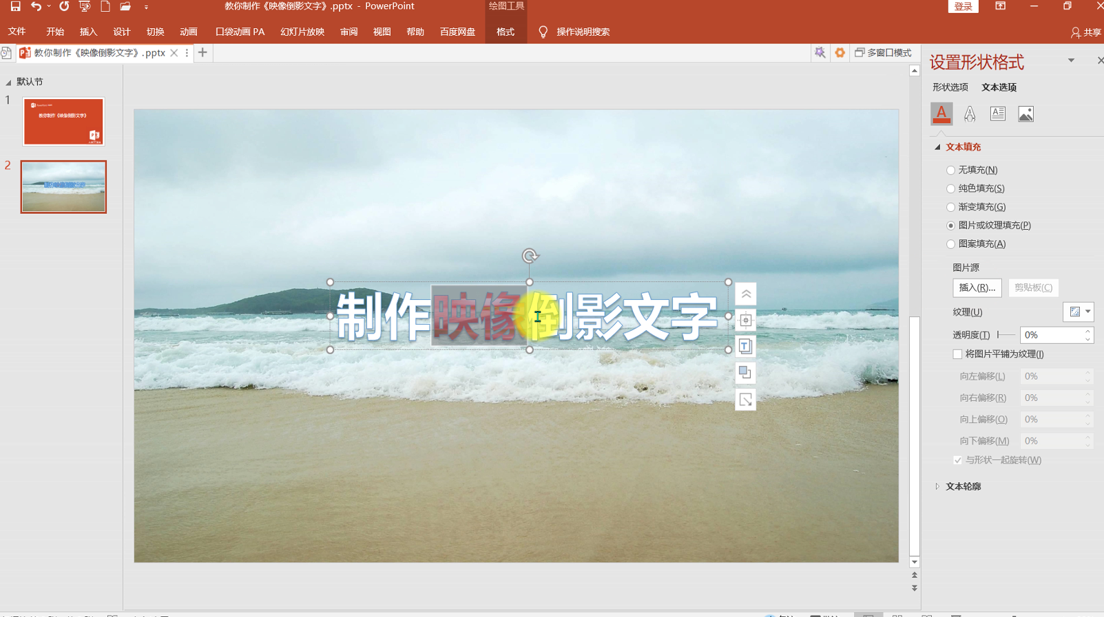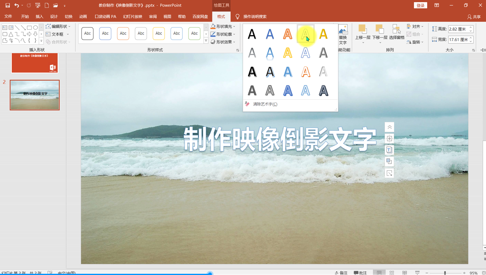 PPT倒影是光照射在平静的水面上所成的虚像,那么如何把文字做成倒影,就像在水里面的倒影一样呢?本例是插入艺术字,利用艺术字自身的效果实现的。