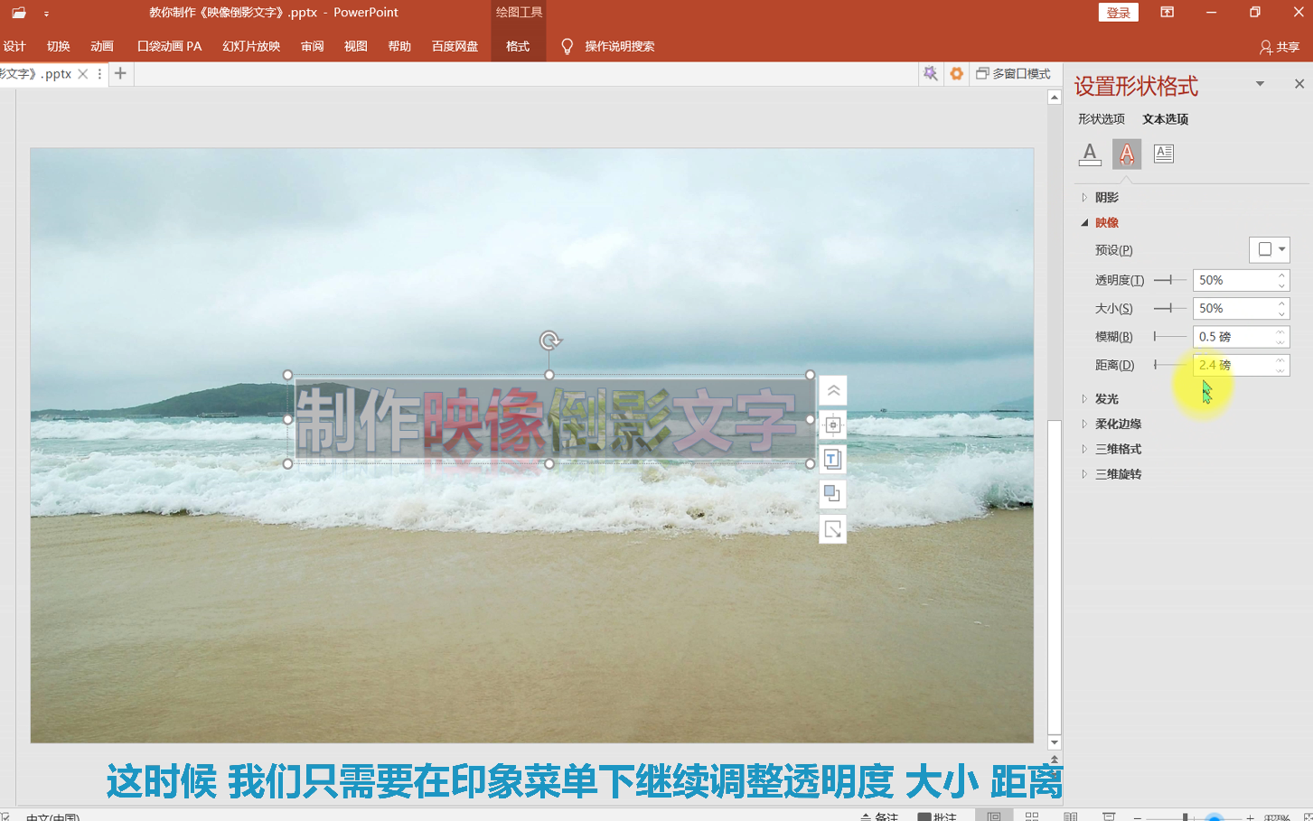在“文字效果”里选择“映像”,添加一个映像变体之后,我们的文字内容就会出现一个倒影了,这时候我们只需要在“映像”菜单下继续调整“透明度、大小、距离、模糊”等参数即可。映像变体预设中,选择紧密映像4磅偏移量。