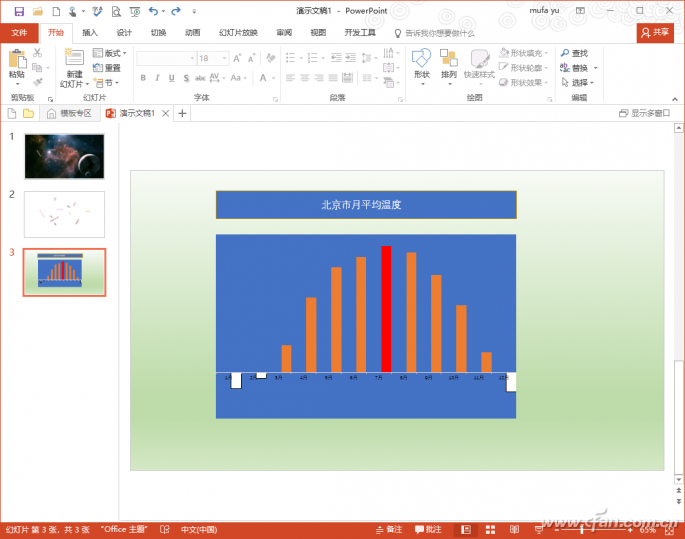 可视化图表可以借助Excel进行制作,不过在Excel中默认生成的图表并不适宜直接在PPT中展示。比如现在需要在幻灯片中直观表达北京月平均气温最高,在Excel生成柱形图方式,直接复制到PPT显示并不直观。