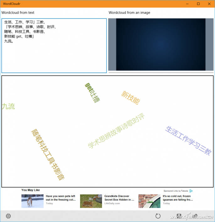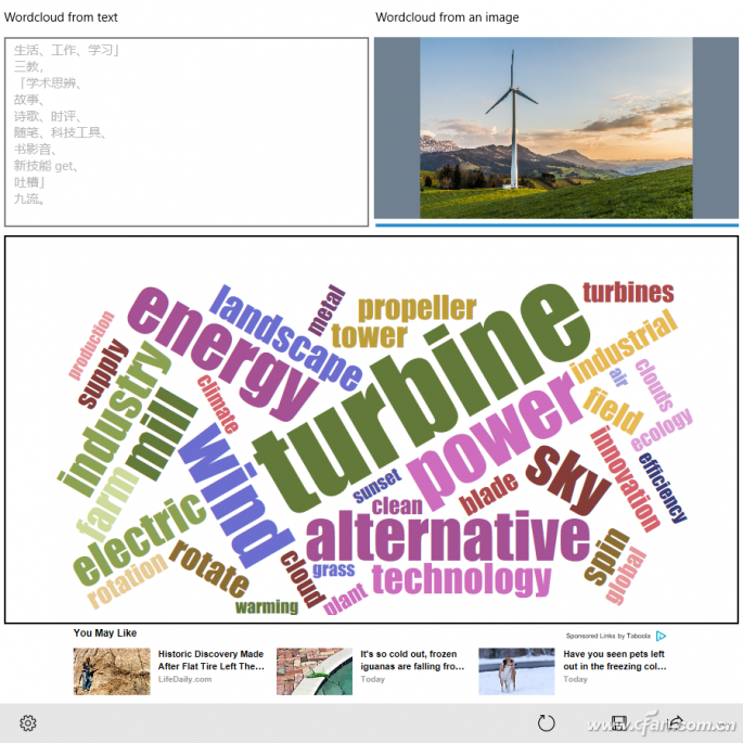 对于Windows 10用户可以直接在应用商店下载“Word Cloud”,启动应用后在左侧文字栏输入需要表达的关键字,文字输入完成后会在下方的窗格预览到文字云的效果。文字的排列可以按自己实际需要,如字少则一个字一行,字多或者一个词组一行,每次生成的效果不同。
