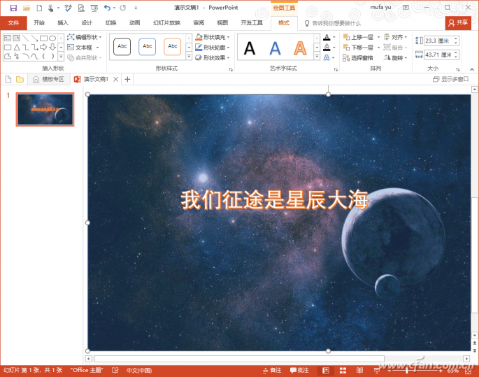 比如需要在某张幻灯片中表达风能是清洁能源的主题,那么直接使用一张风能发电的图片,然后配上简单文字说明就可以很好表达这个主题。如果需要表达的是比较抽象的主题,如对于封面照片,很多BOSS们都要大气、上档次。如果直接搜索这类关键字往往找不到好的图片,此时需要换个思路来搜索大气的图片。超级大气可以使用宇宙、银河系、地球图片就可以很好表达,如果表现产品大气,那么大海、城市、探索、空灵这类图片也能很好表达,再加上一些简单的文字即可。如表达星辰大海的气势,把一张星球图片作为全景的背景,同时加层矩形作为蒙版即可。